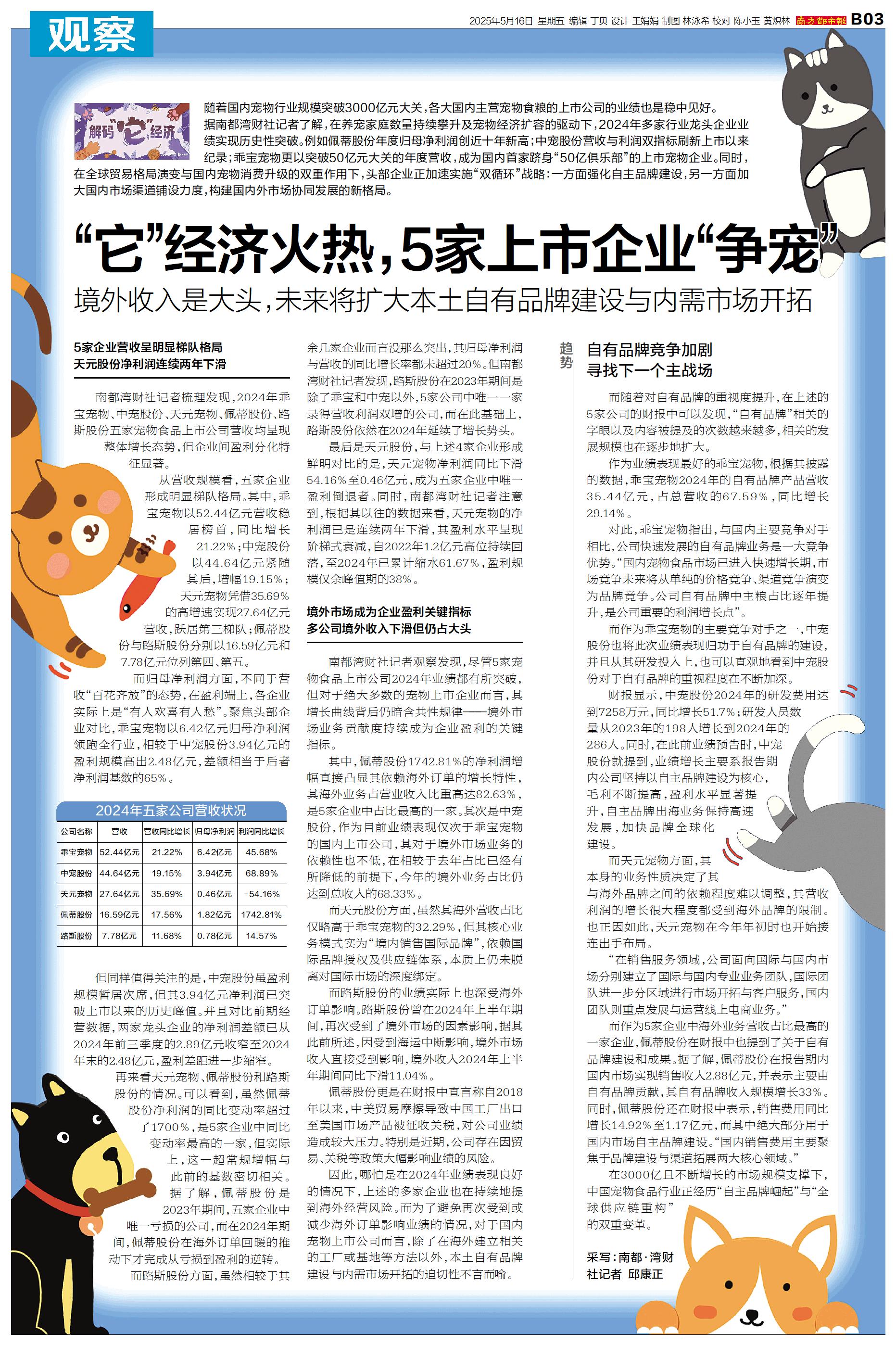 随着国内宠物行业规模突破3000亿元大关,各大国内主营宠物食粮的上市公司的业绩也是稳中见好。 据南都湾财社记者了解,在养宠家庭数量持续攀升及宠物经济扩容的驱动下,2024年多家行业龙头企业业绩实