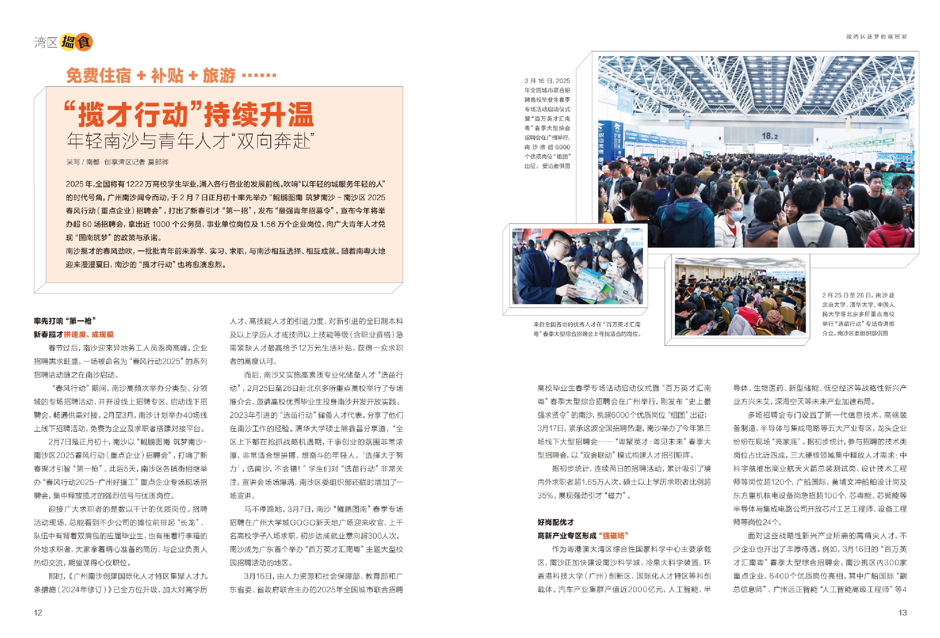 3月16日,由人力资源和社会保障部、教育部和广东省委、省政府联合主办的2025年全国城市联合招聘高校毕业生春季专场活动启动仪式暨“百万英才汇南粤”春季大型综合招聘会在广州举行,刚发布“史上最强求贤令”的南沙,携超6000个优质岗位“组团”出征;3月17日,紧承这波全国招聘热潮,南沙举办了今年第三场线下大型招聘会——“粤聚英才·粤见未来”春季大型招聘会,以“双会联动”模式构建人才招引矩阵。