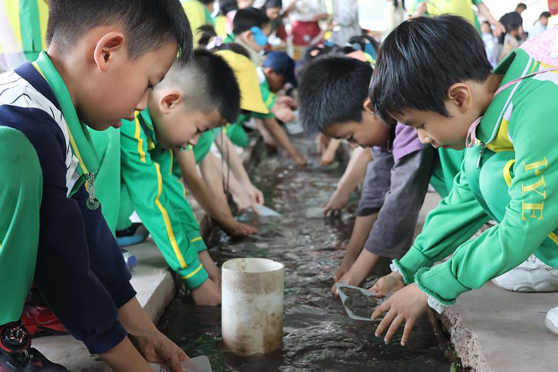 一众学生在云纱星韵研学,体验香云纱染整工艺。