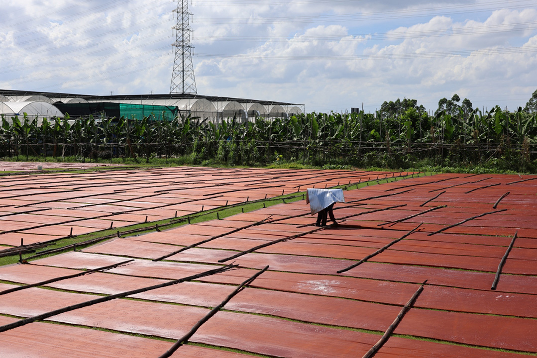 工人在云纱星韵香云纱(非遗)文化园晒莨。