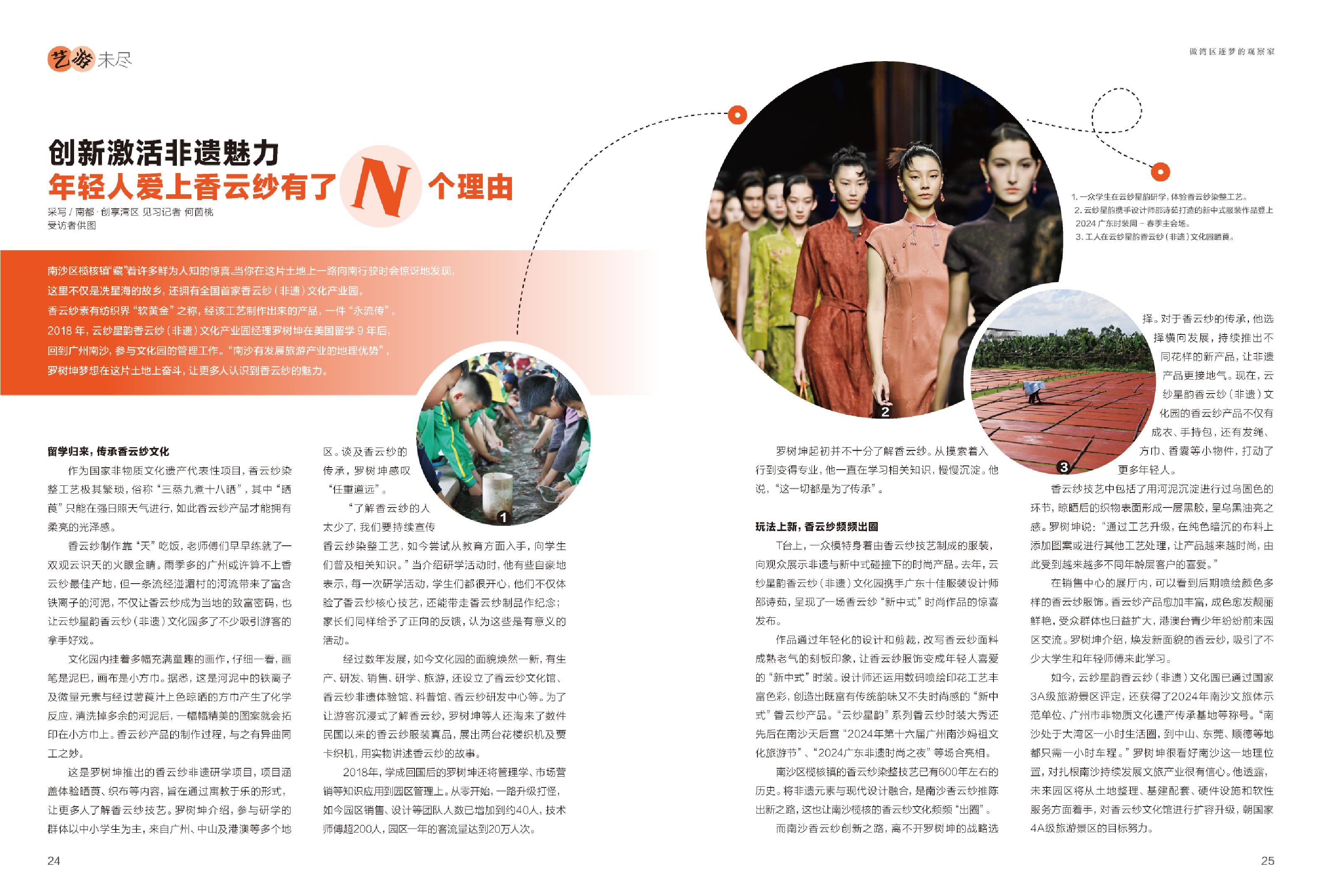 2018年,云纱星韵香云纱(非遗)文化产业园经理罗树坤在美国留学9年后,回到广州南沙,参与文化园的管理工作。“南沙有发展旅游产业的地理优势”,罗树坤梦想在这片土地上奋斗,让更多人认识到香云纱的魅力。