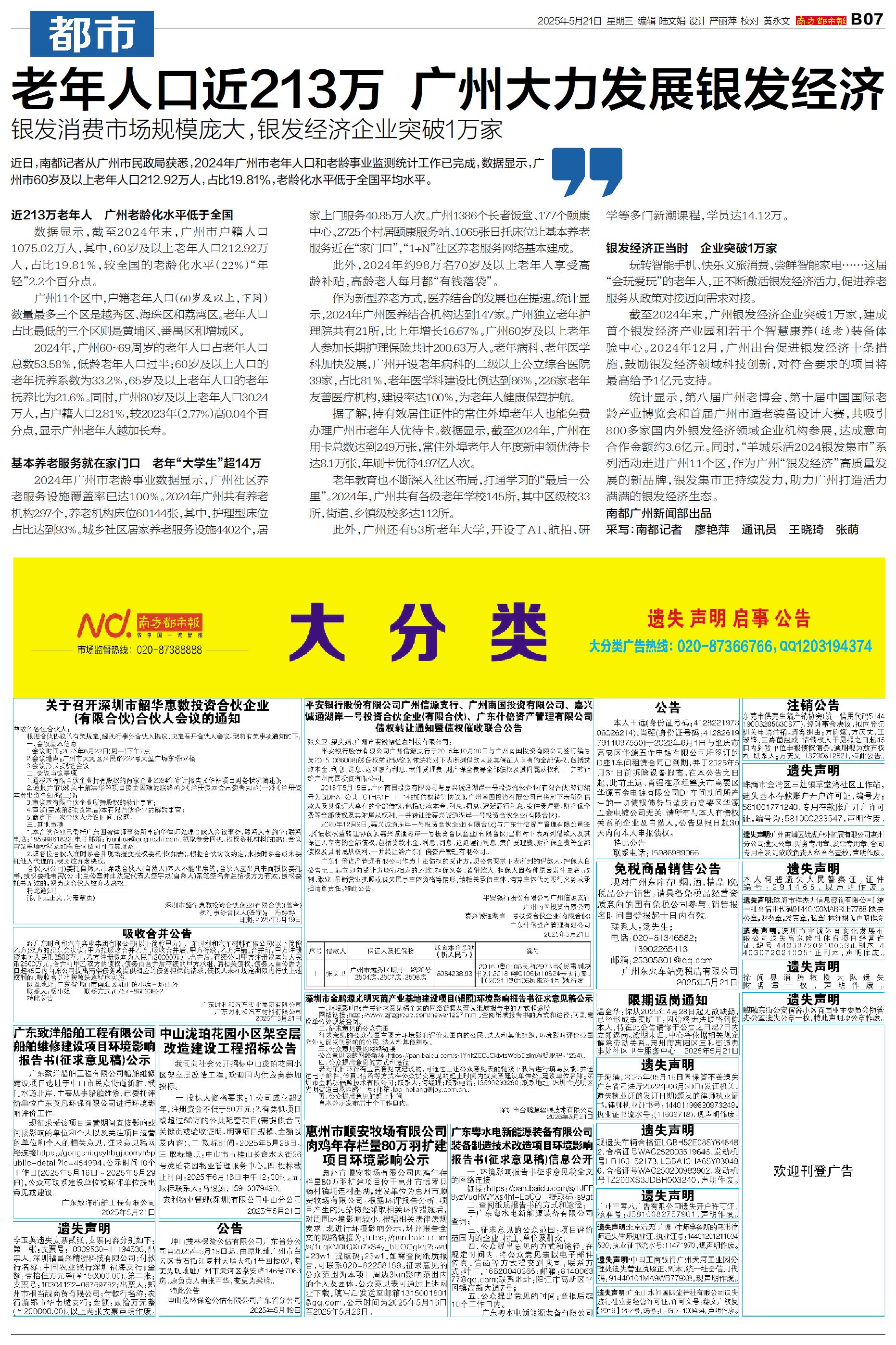 数据显示,截至2024年末,广州市户籍人口1075.02万人,其中,60岁及以上老年人口212.92万人,占比19.81%,较全国的老龄化水平(22%)“年轻”2.2个百分点。