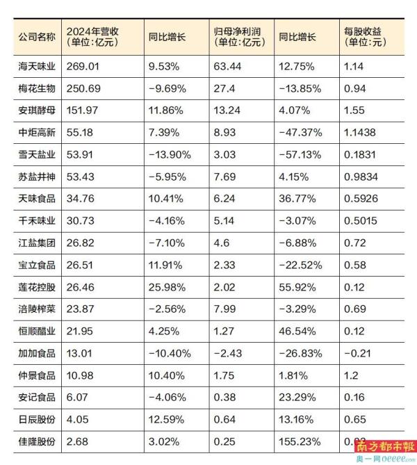 从年报看,在记者统计的18家调味品上市公司中,四成公司业绩处于下滑态势:有8家企业的营收同比下滑,也有8家上市公司的净利润同比下滑,具体包括中炬高新(600872.SH)、雪天盐业(600929.SH)、千禾味业(603027.SH)、江盐集团(601065.SH)以及加加食品(002650.SZ)等。