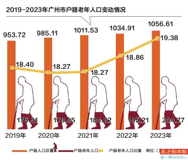 以户籍人口中老龄人口占比看,市民政部门官方数据显示,该比例在2021年是18.27%,2022年是18.86%,2023年和2024年分别是19.38%和19.81%,基本符合《广州市老龄事业发展“十四五”规划》中预测的“十四五时期广州人口老龄化将进入快车道,老年人口规模进一步加大,老年人口比例不断提升”。