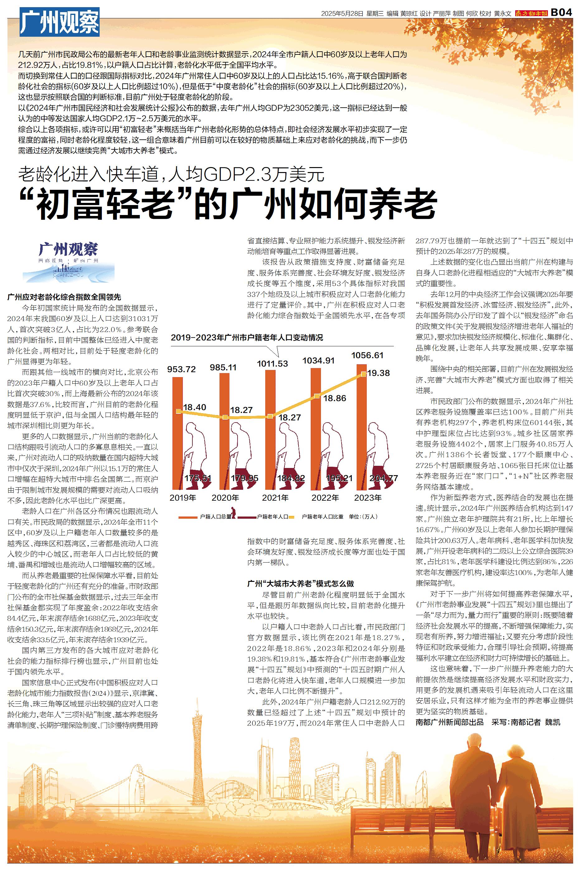 几天前广州市民政局公布的最新老年人口和老龄事业监测统计数据显示,2024年全市户籍人口中60岁及以上老年人口为212.92万人,占比19.81%,以户籍人口占比计算,老龄化水平低于全国平均水平。