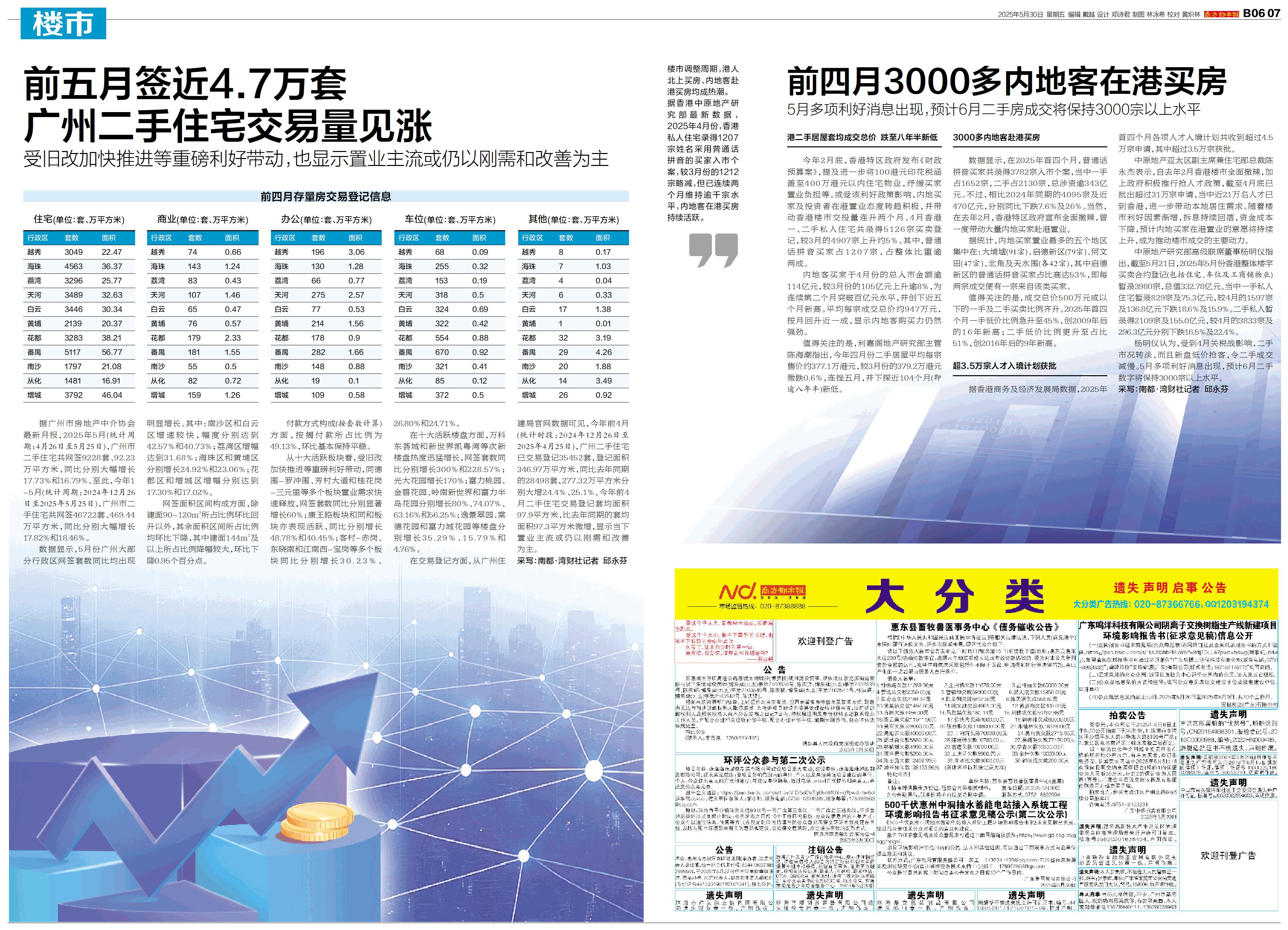 据广州市房地产中介协会最新月报,2025年5月(统计周期:4月26日至5月25日),广州市二手住宅共网签9228套、92.23万平方米,同比分别大幅增长17.73%和16.79%。至此,今年1-5