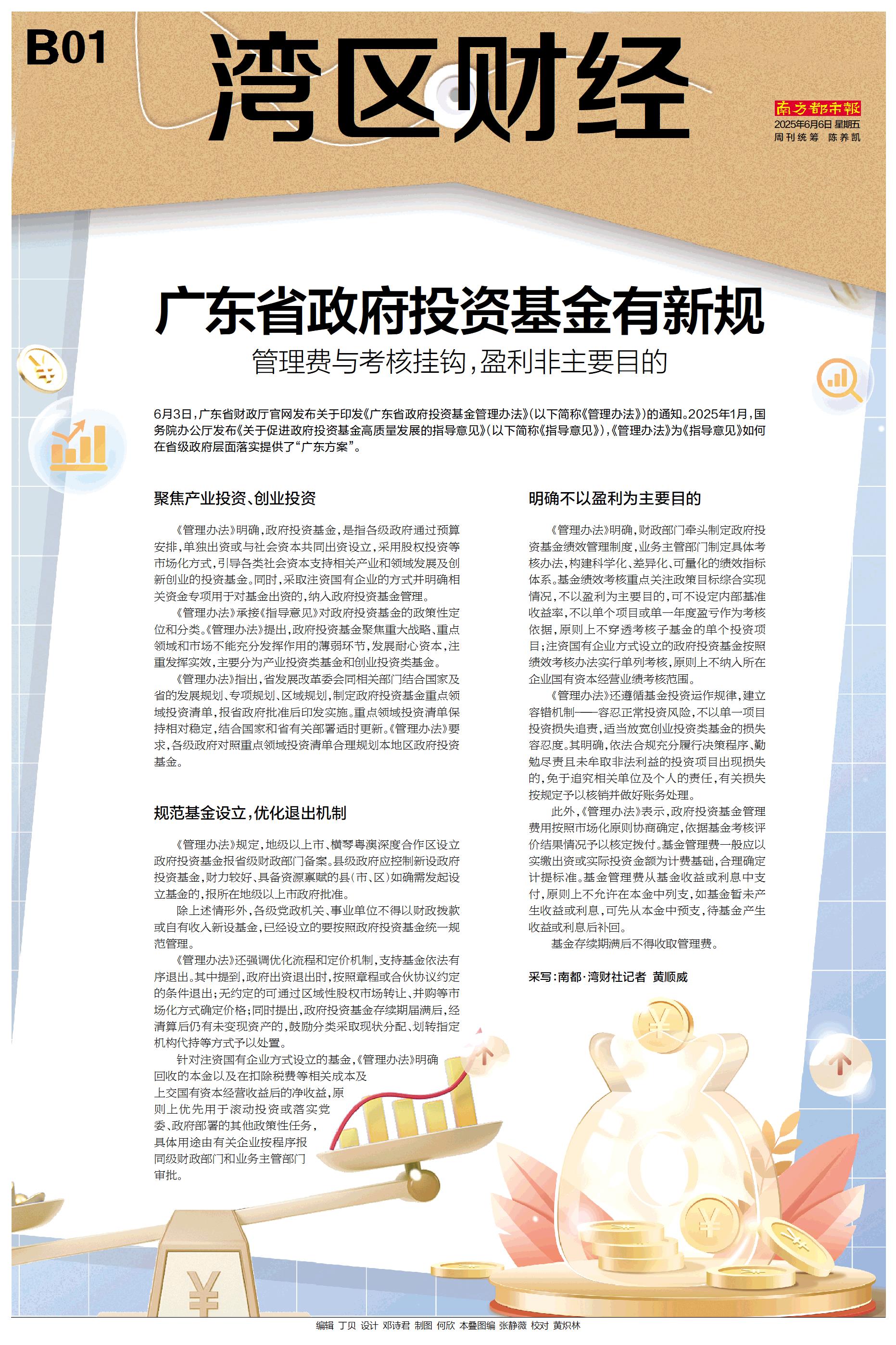6月3日,广东省财政厅官网发布关于印发《广东省政府投资基金管理办法》(以下简称《管理办法》)的通知。2025年1月,国务院办公厅发布《关于促进政府投资基金高质量发展的指导意见》(以下简