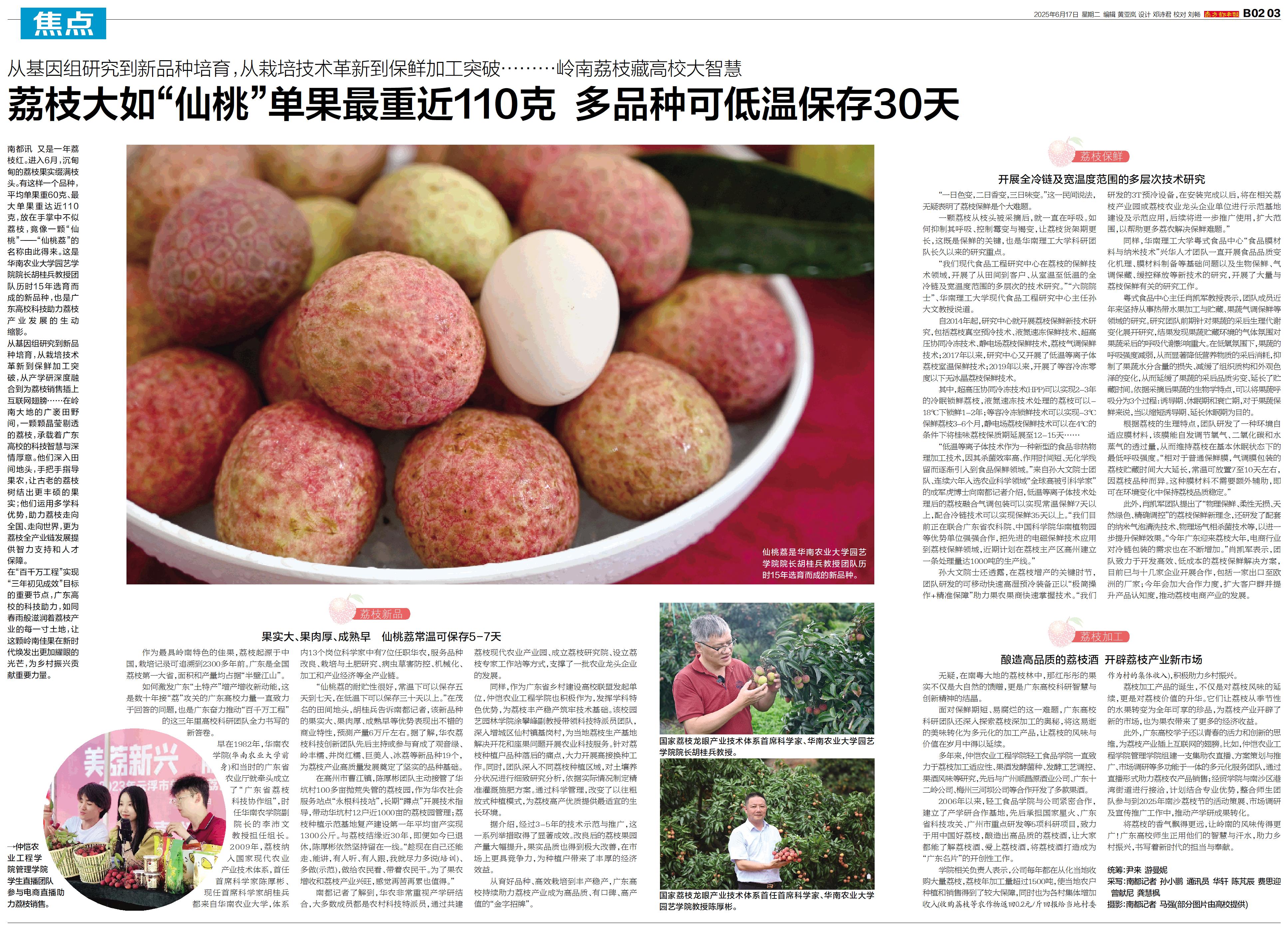 南都讯 又是一年荔枝红。进入6月,沉甸甸的荔枝果实缀满枝头。有这样一个品种,平均单果重60克、最大单果重达近110克,放在手掌中不似荔枝,竟像一颗“仙桃”——“仙桃荔”的名称由此得来。这是华南农业