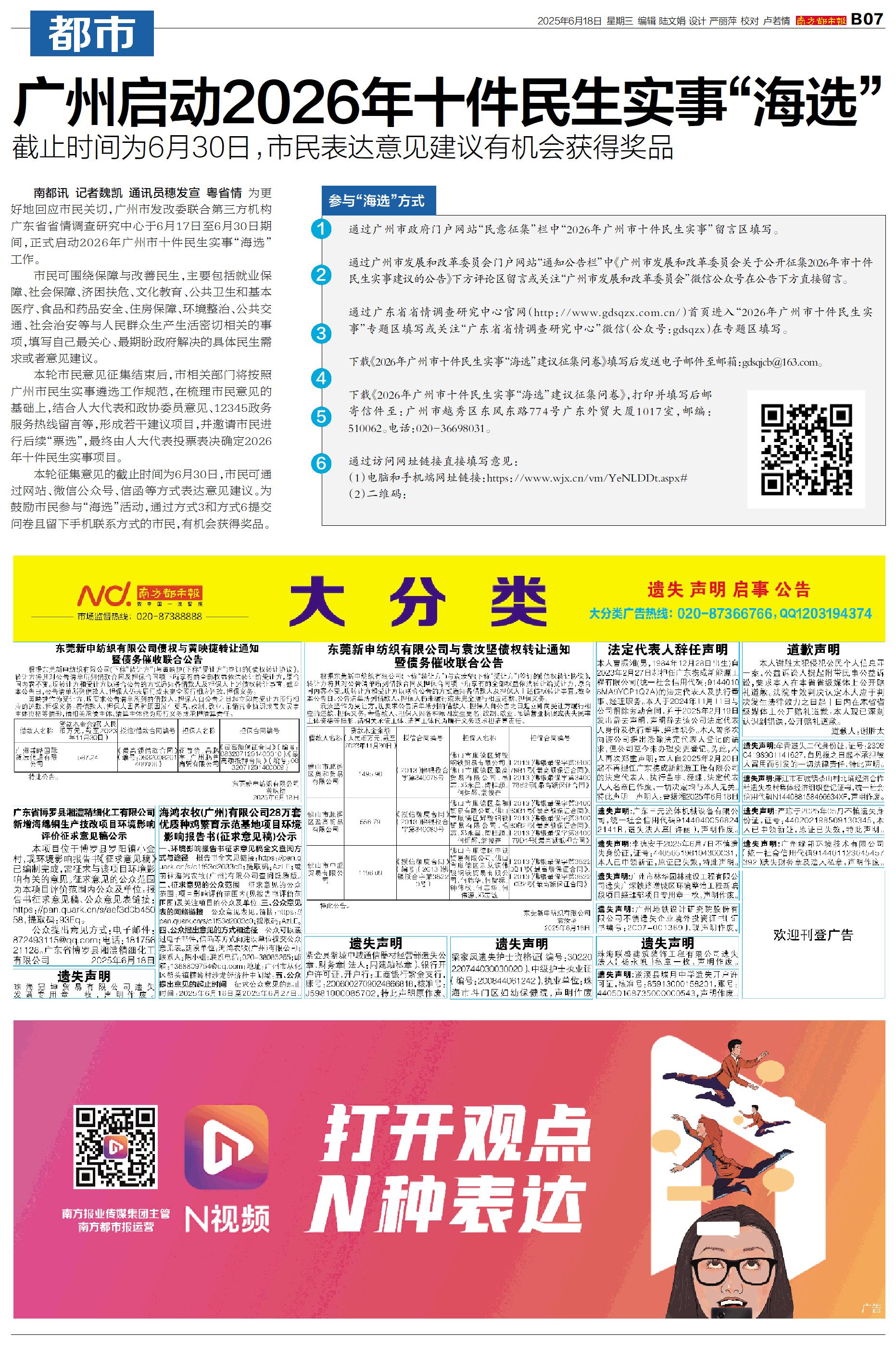 南都讯 记者魏凯 通讯员穗发宣 粤省情 为更好地回应市民关切,广州市发改委联合第三方机构广东省省情调查研究中心于6月17日至6月30日期间,正式启动2026年广州市十件民生实事“海选”工作。 市