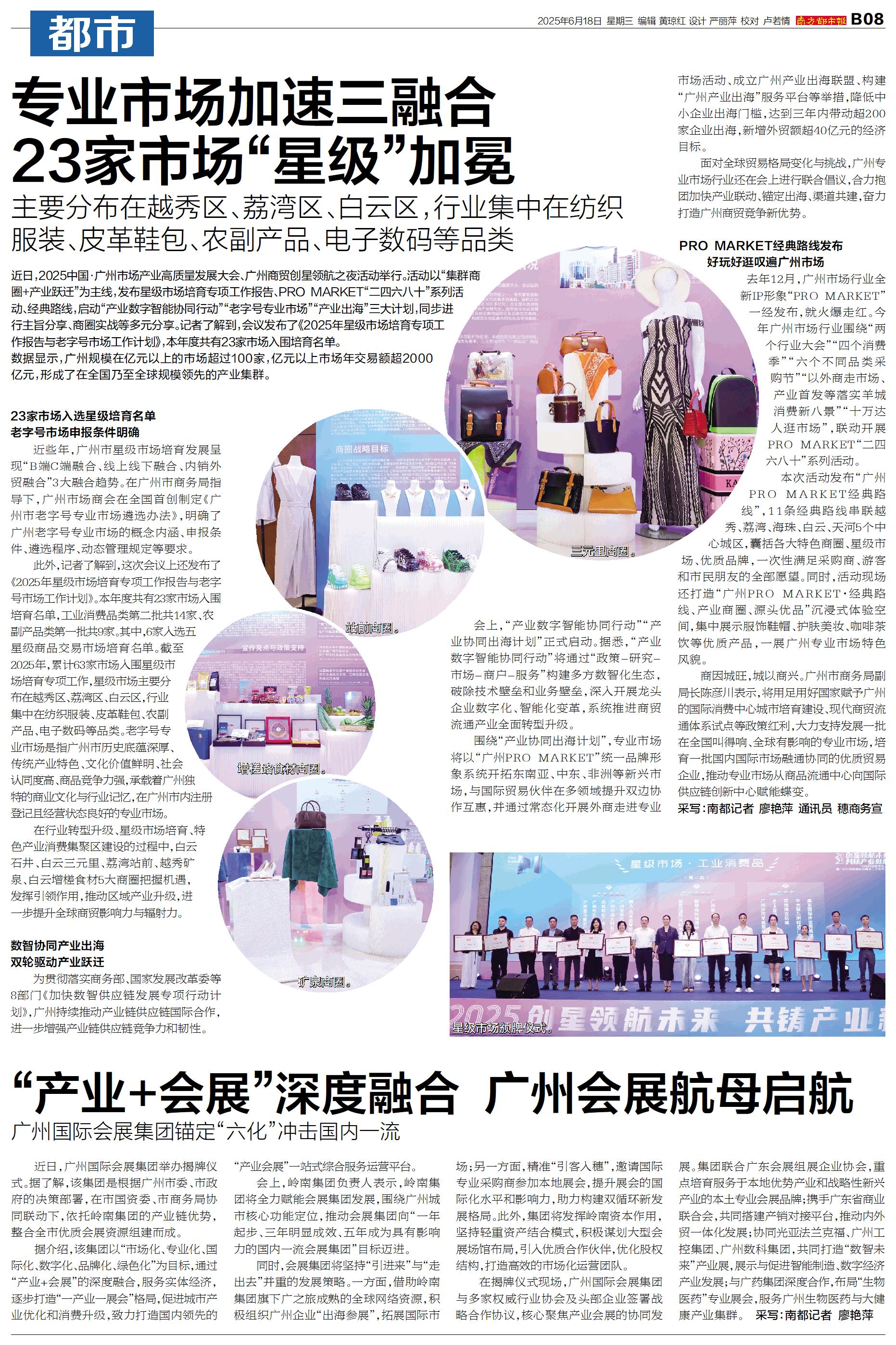 近日,2025中国·广州市场产业高质量发展大会、广州商贸创星领航之夜活动举行。活动以“集群商圈+产业跃迁”为主线,发布星级市场培育专项工作报告、PRO MARKET“二四六八十”系列活动、经典路线