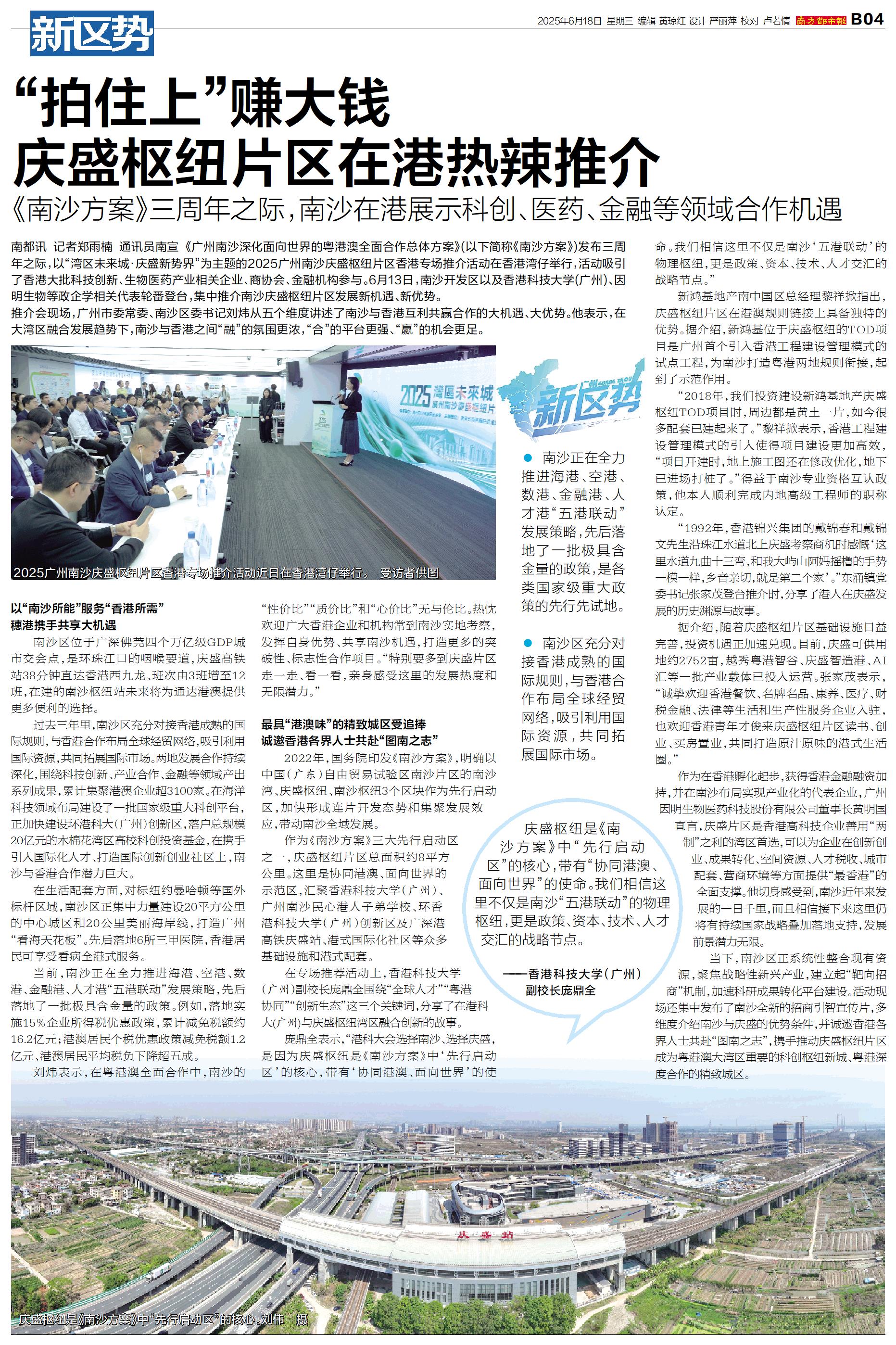 庆盛枢纽是《南沙方案》中“先行启动区”的核心,带有“协同港澳、面向世界”的使命。我们相信这里不仅是南沙“五港联动”的物理枢纽,更是政策、资本、技术、人才交汇的战略节点。 ——香港科技大学(广