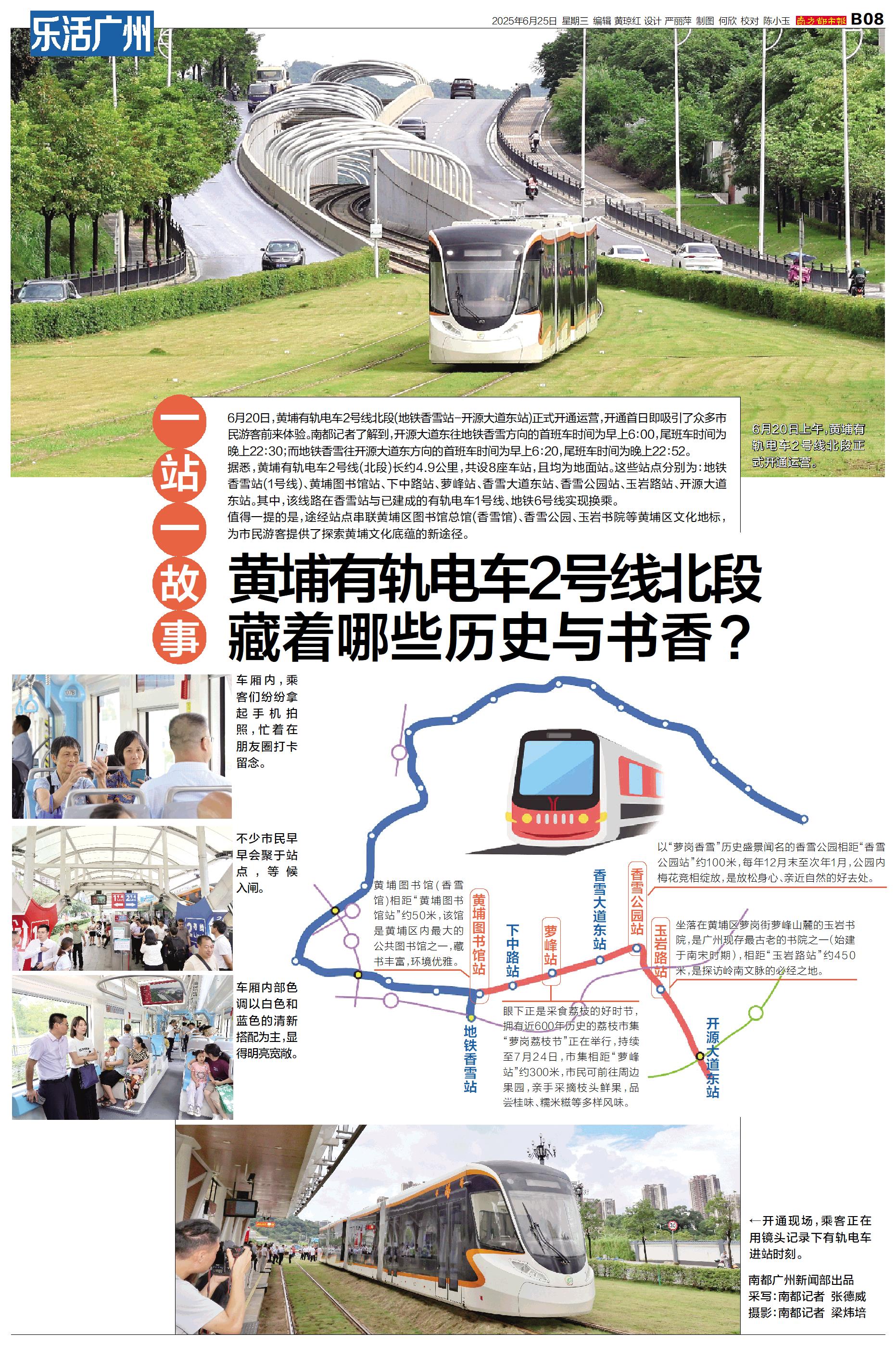 一站一故事 6月20日,黄埔有轨电车2号线北段(地铁香雪站-开源大道东站)正式开通运营,开通首日即吸引了众多市民游客前来体验。南都记者了解到,开源大道东往地铁香雪方向的首班车时间为早上6:00,
