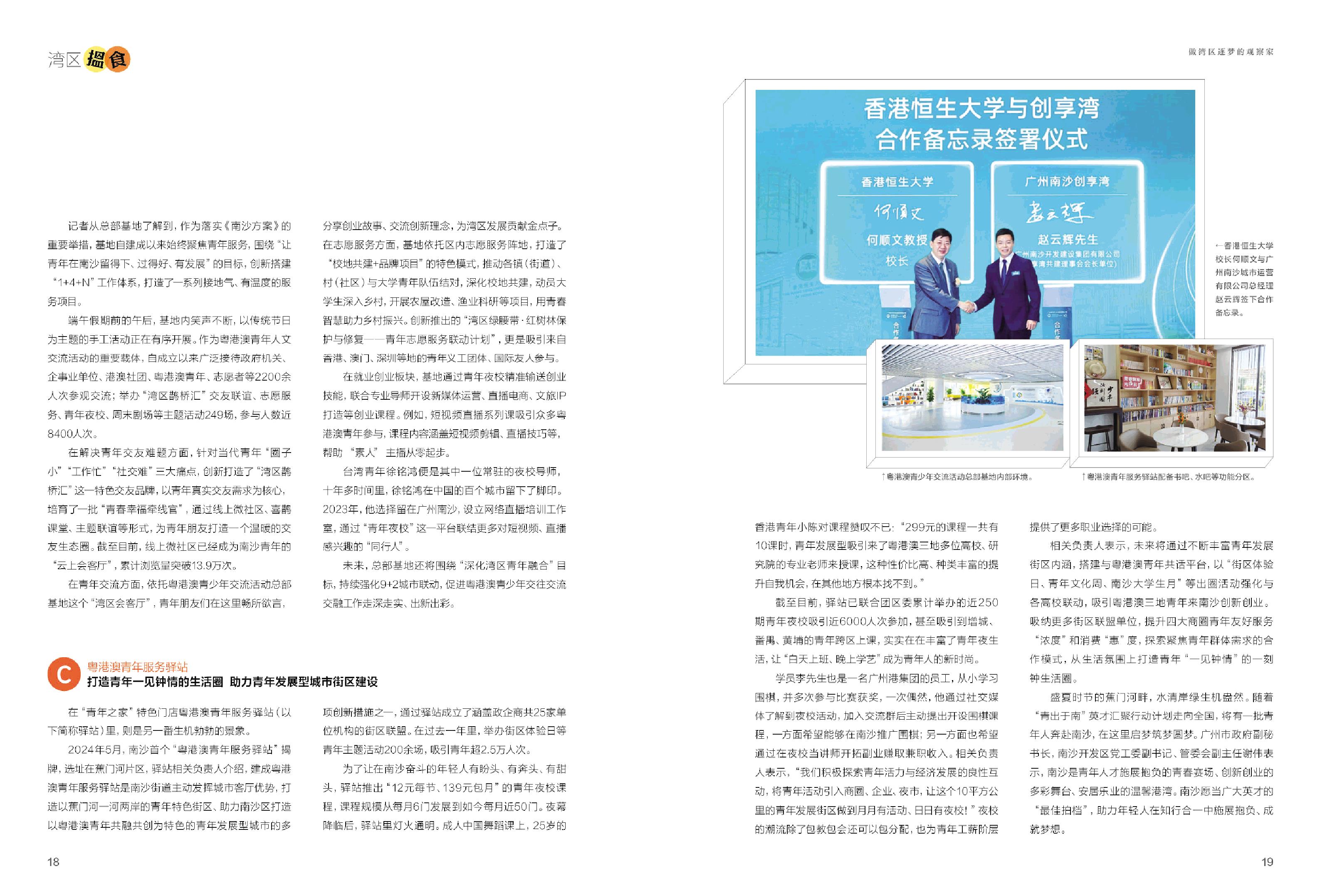 香港恒生大学校长何顺文与广州南沙城市运营有限公司总经理赵云辉签下合作备忘录。 粤港澳青少年交流活动总部基地内部环境。