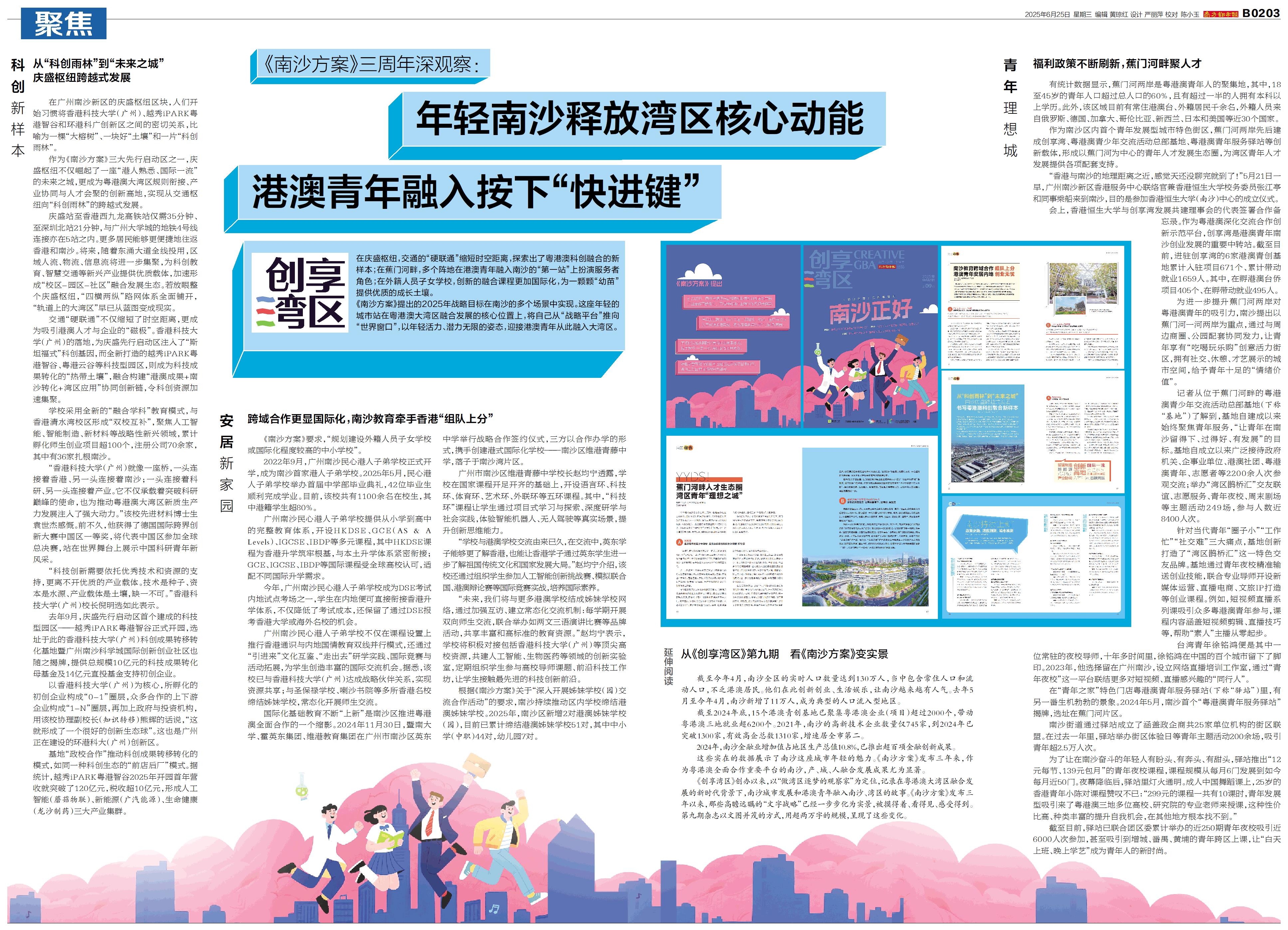 在庆盛枢纽,交通的“硬联通”缩短时空距离,探索出了粤港澳科创融合的新样本;在蕉门河畔,多个阵地在港澳青年融入南沙的“第一站”上扮演服务者角色;在外籍人员子女学校,创新的融合课程更加国际化,为一颗颗