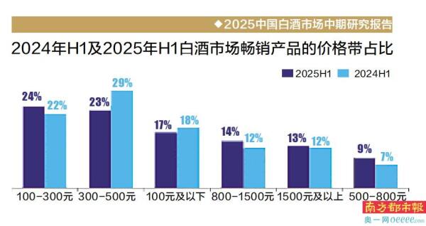 据《2025中国白酒市场中期研究报告》,2025年1-6月白酒市场经销商、零售商反馈市场动销最好的前三价格带分别为100-300元、300-500元、100元及以下;倒挂程度前三价格带分别为800-1500元、500-800元、300-500元。中低端畅销价位带由300-500元进一步向100-300元下沉,500-800元价位带产品生存则最为困难。