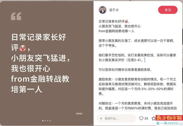 事实上,周寒阳在正式转投教培行业之前,就有过相关经验。在小红书中,他表示,“大学期间就兼职做家教,并且参加云南支教团活动,学校期间断断续续兼职从业约三个学期。”