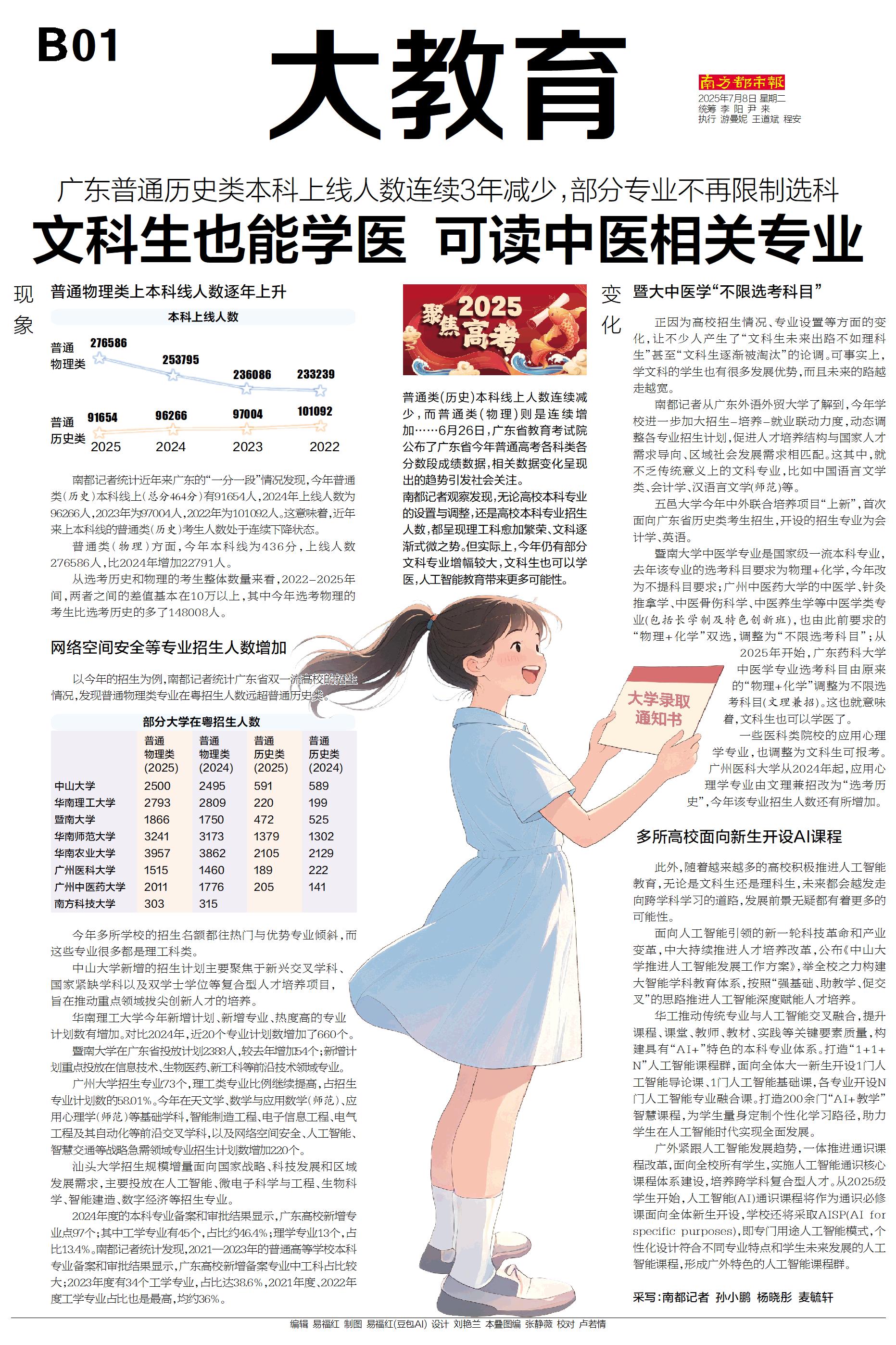 暨南大学中医学专业是国家级一流本科专业,去年该专业的选考科目要求为物理+化学,今年改为不提科目要求;广州中医药大学的中医学、针灸推拿学、中医骨伤科学、中医养生学等中医学类专业(包括长学制及特色创新班),也由此前要求的“物理+化学”双选,调整为“不限选考科目”;从2025年开始,广东药科大学中医学专业选考科目由原来的“物理+化学”调整为不限选考科目(文理兼招)。这也就意味着,文科生也可以学医了。