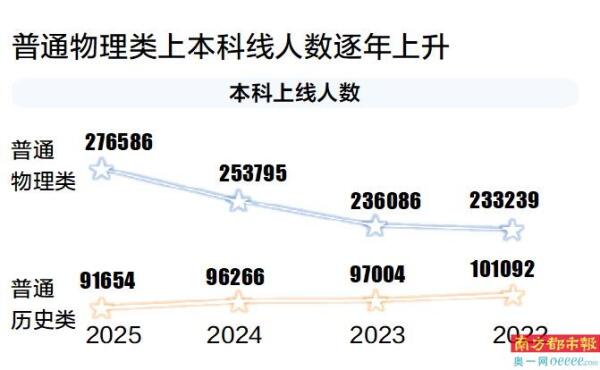 普通类(物理)方面,今年本科线为436分,上线人数276586人,比2024年增加22791人。