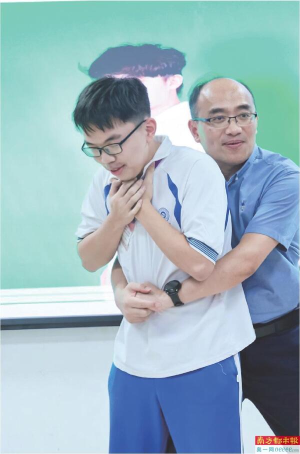 广州市第一人民医院模拟医学中心主任王西富为高中生讲解海姆立克急救法。