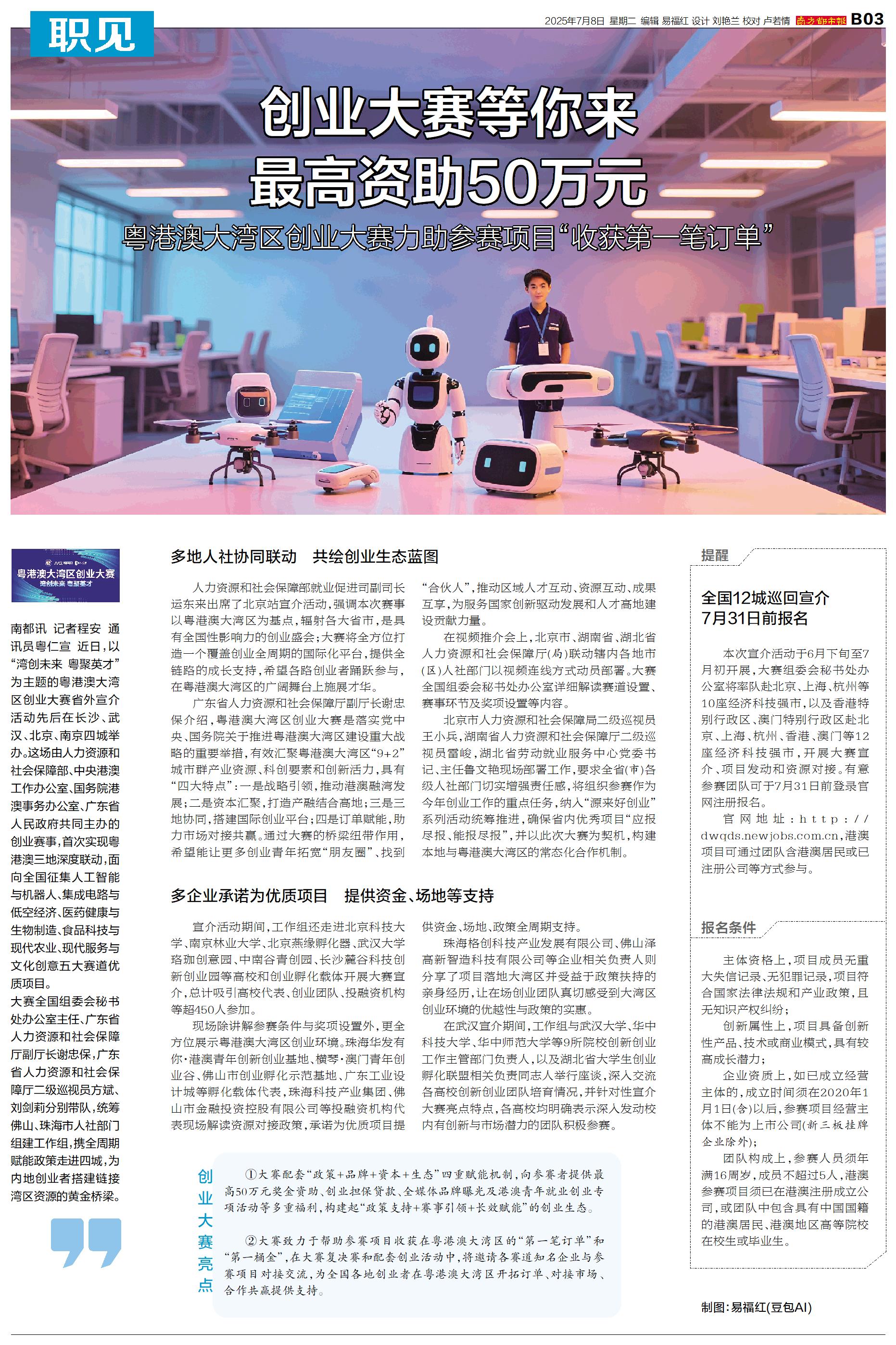 南都讯 记者程安 通讯员粤仁宣 近日,以“湾创未来 粤聚英才”为主题的粤港澳大湾区创业大赛省外宣介活动先后在长沙、武汉、北京、南京四城举办。这场由人力资源和社会保障部、中央港澳工作办公室、国务院港