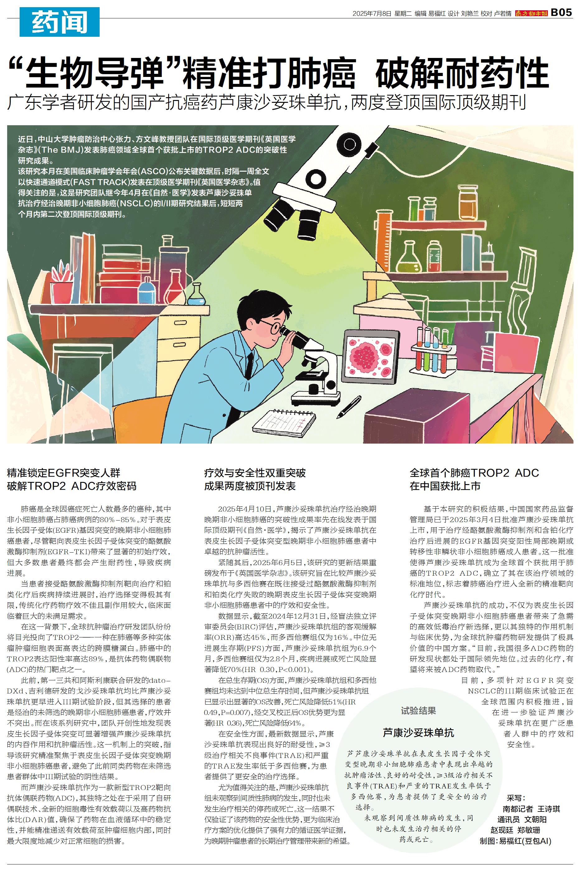 近日,中山大学肿瘤防治中心张力、方文峰教授团队在国际顶级医学期刊《英国医学杂志》(The BMJ)发表肺癌领域全球首个获批上市的TROP2 ADC的突破性研究成果。 该研究本月在美国临床肿瘤学会