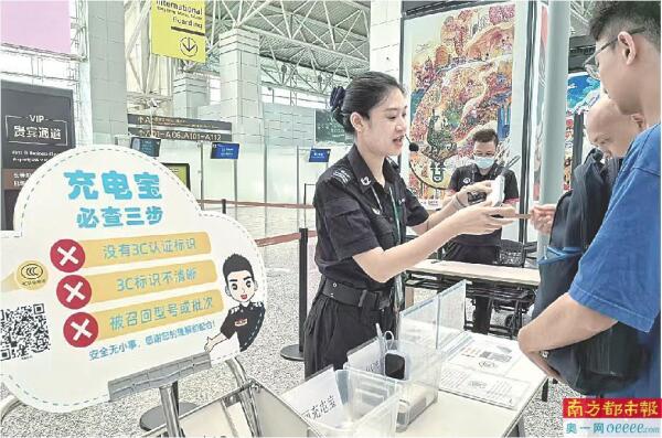 6月26日,民航局发布紧急通知6月28日起禁止旅客携带没有3C标识、3C标识不清晰、被召回型号或批次的充电宝乘坐境内航班。日前,白云机场利用航站楼广播定期播报携带充电宝乘机规定,通过在值机区、安检区电子显示屏滚动播放以及在醒目位置增加提示等,多场景密集宣传携带充电宝乘机规定。