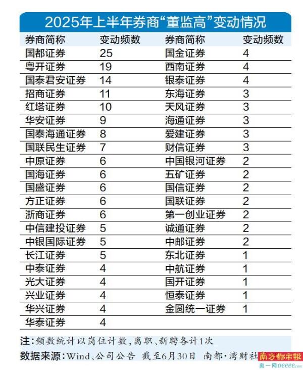 2025年上半年,券商行业的人事变动浪潮汹涌而至。据Wind平台与公司公告显示,截至6月30日,已有41家券商的“董监高”成员发生变动,涉及离职、新聘等多种情况,变动频次高达214次。