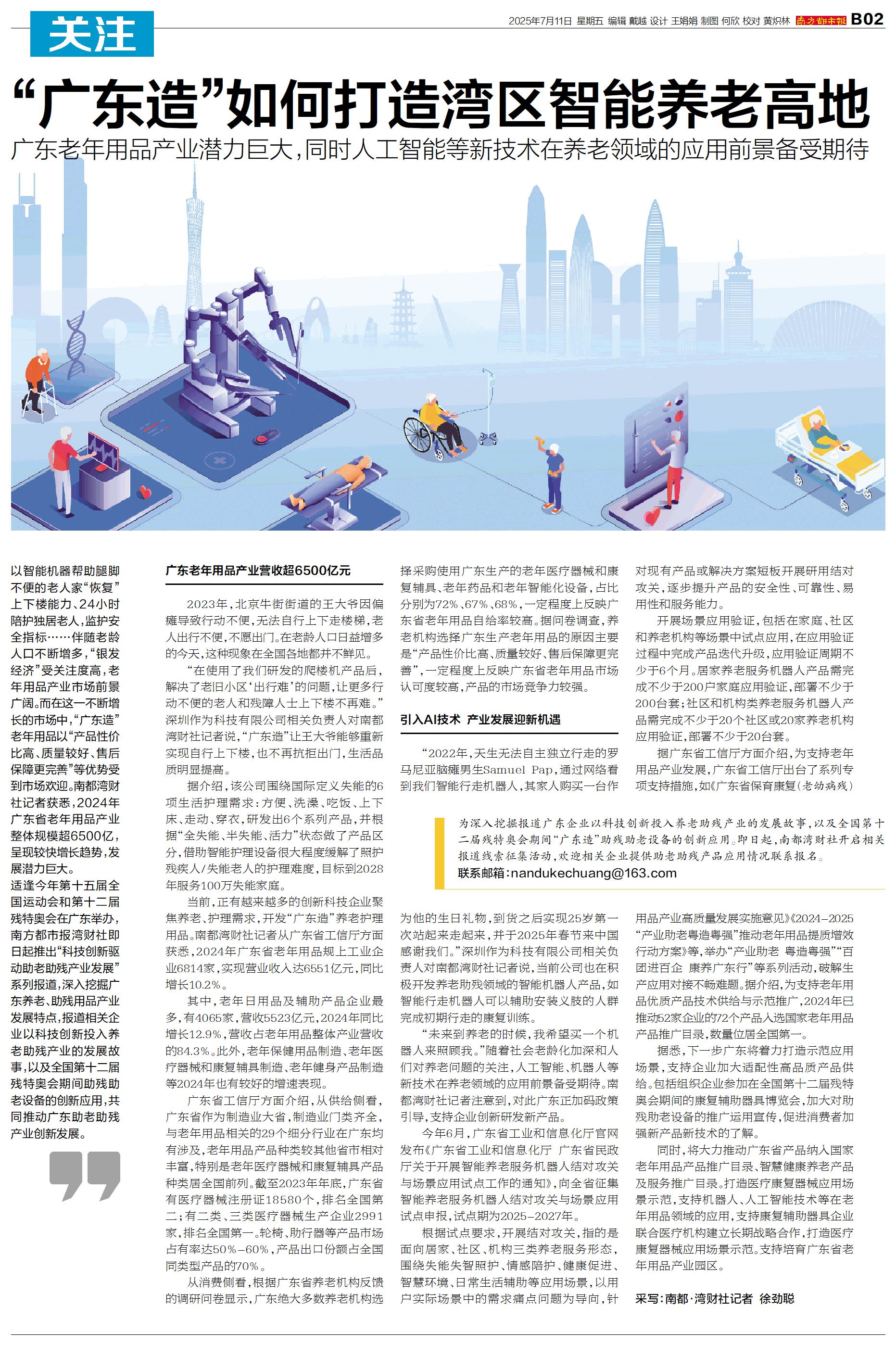 以智能机器帮助腿脚不便的老人家“恢复”上下楼能力、24小时陪护独居老人,监护安全指标……伴随老龄人口不断增多,“银发经济”受关注度高,老年用品产业市场前景广阔。而在这一不断增长的市场中,“广东造”