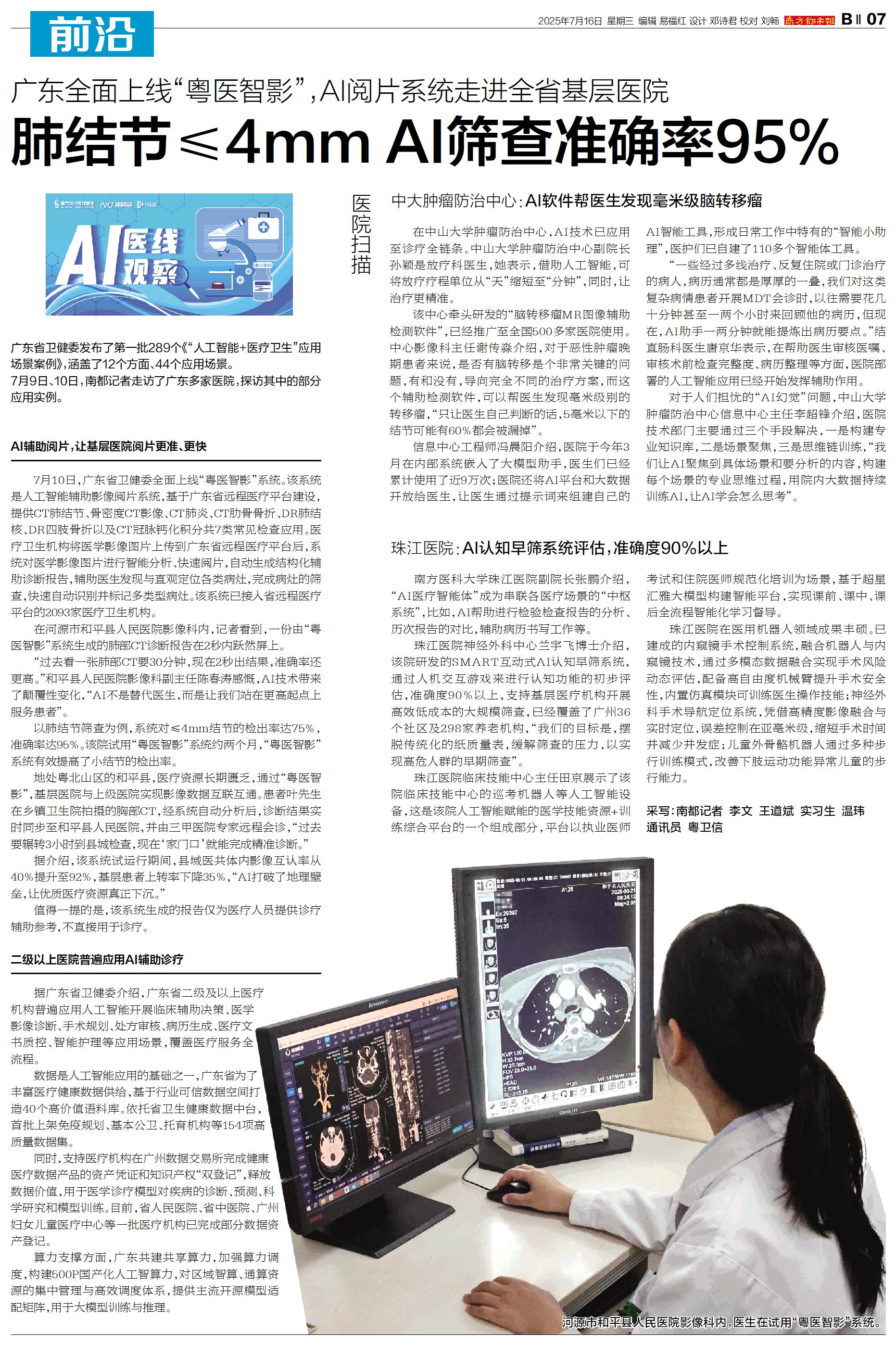广东省卫健委发布了第一批289个《“人工智能+医疗卫生”应用场景案例》,涵盖了12个方面、44个应用场景。 7月9日、10日,南都记者走访了广东多家医院,探访其中的部分应用实例。 AI辅助阅片