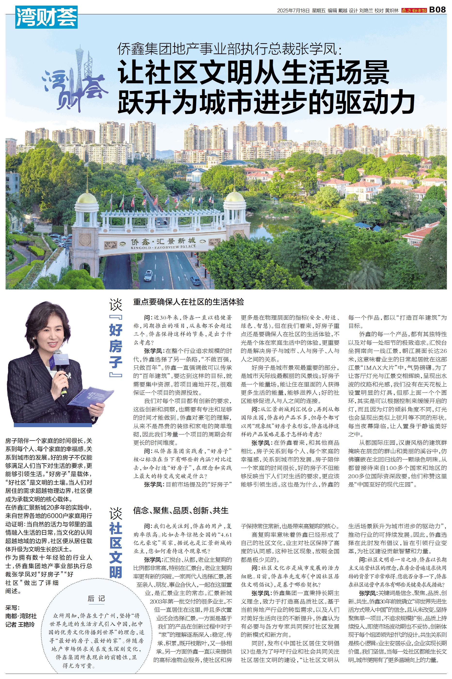 张学凤:在侨鑫看来,和其他商品相比,房子关系到每个人、每个家庭的幸福感,关系到城市的发展。房子陪伴一个家庭的时间很长,好的房子不但能够反映当下人们对生活的要求,更应该能够引领生活。这也是为什么,侨鑫的每一个作品,都以“打造百年建筑”为目标。