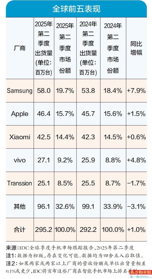 全球智能手机市场的复苏之路崎岖。国际数据公司(IDC)7月16日发布的最新报告显示,2025年第二季度全球智能手机出货量为2.952亿部,同比微增1.0%,增长势头放缓。