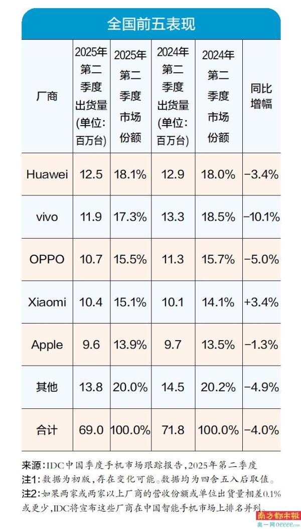 相比之下,中国市场的表现则低于预期。IDC报告显示,第二季度中国市场前五名分别为华为(1250万台)、vivo(1190万台)、OPPO(1070万台)、小米(1040万台)和苹果(960万台)。其中,除小米实现3.4%的同比增长外,其余四家均出现不同程度的下滑。