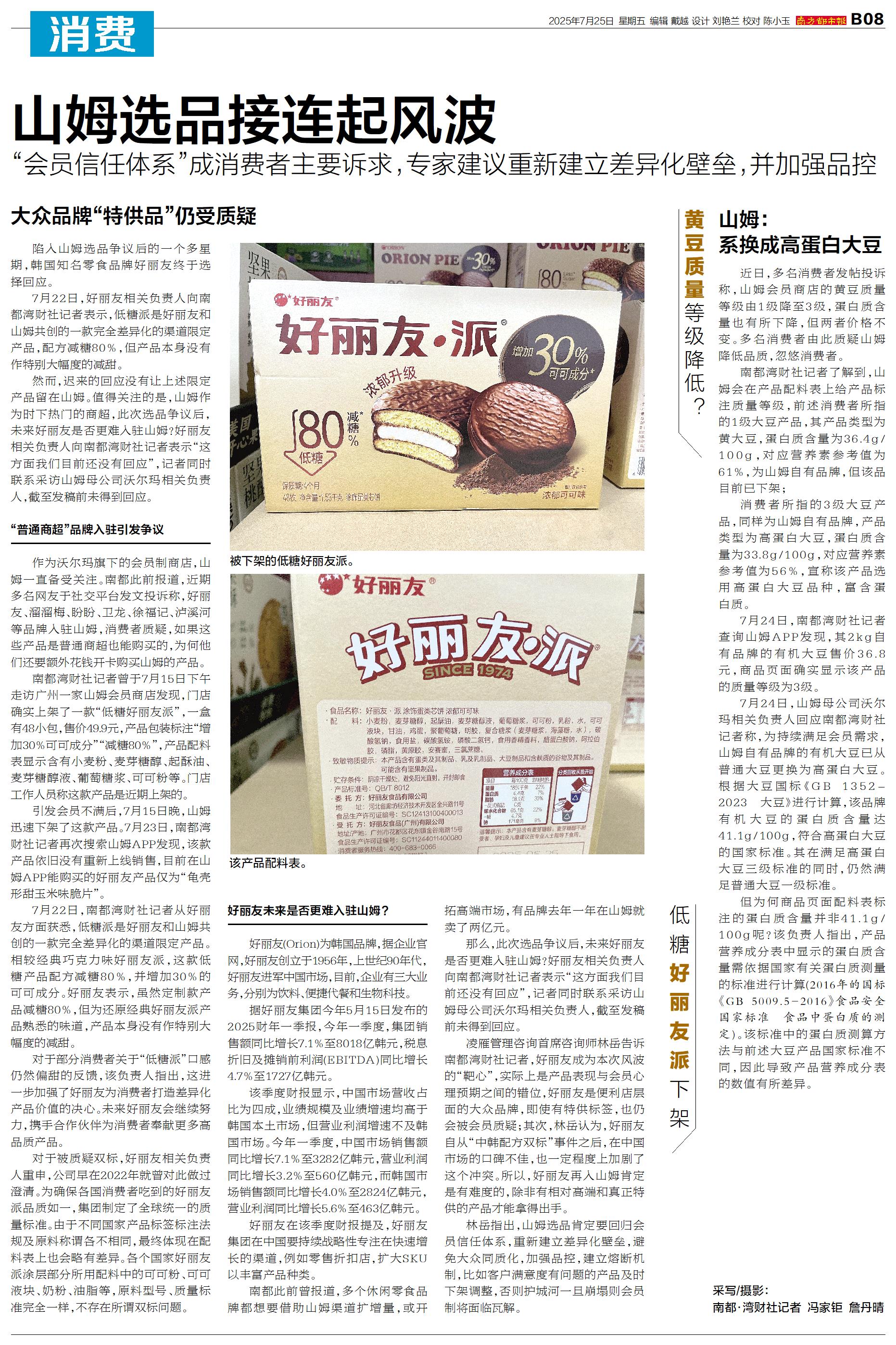 大众品牌“特供品”仍受质疑 低糖好丽友派下架 陷入山姆选品争议后的一个多星期,韩国知名零食品牌好丽友终于选择回应。 7月22日,好丽友相关负责人向南都湾财社记者表示,低糖派是好丽友和山姆共创