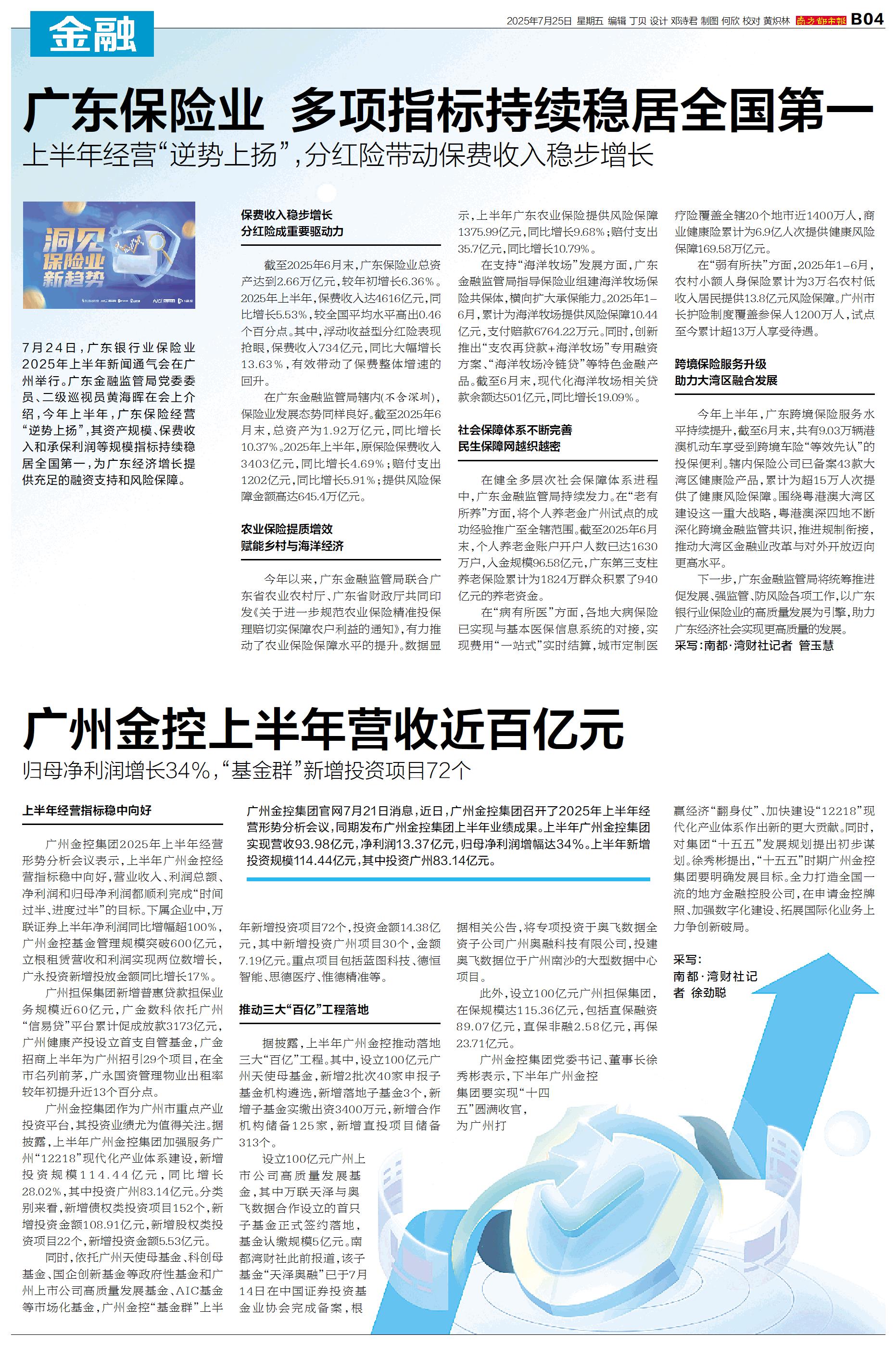 7月24日,广东银行业保险业2025年上半年新闻通气会在广州举行。广东金融监管局党委委员、二级巡视员黄海晖在会上介绍,今年上半年,广东保险经营“逆势上扬”,其资产规模、保费收入和承保利润等规模指标
