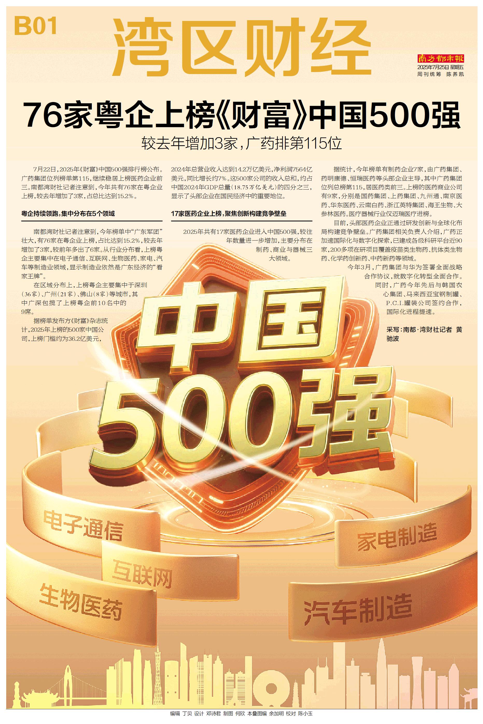7月22日,2025年《财富》中国500强排行榜公布。广药集团位列榜单第115,继续稳居上榜医药企业前三。南都湾财社记者注意到,今年共有76家在粤企业上榜,较去年增加了3家,占总比达到15.2%。