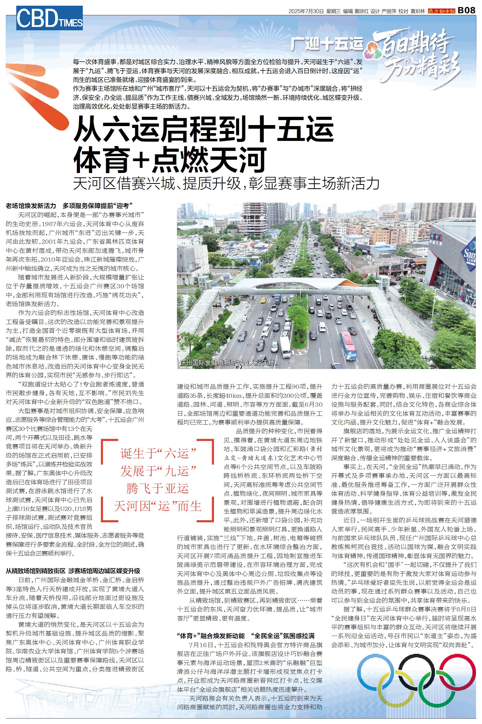 每一次体育盛事,都是对城区综合实力、治理水平、精神风貌等方面全方位检验与提升。天河诞生于“六运”、发展于“九运”、腾飞于亚运,体育赛事与天河的发展深度融合、相互成就。十五运会进入百日倒计时,这座因