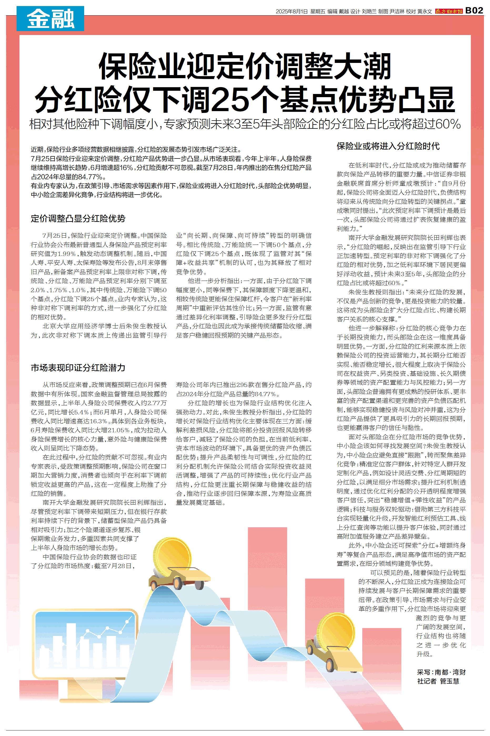 近期,保险行业多项经营数据相继披露,分红险的发展态势引发市场广泛关注。 7月25日保险行业迎来定价调整,分红险产品优势进一步凸显。从市场表现看,今年上半年,人身险保费继