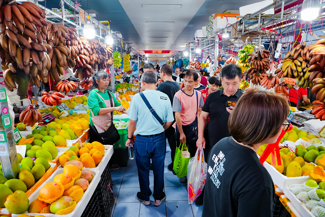 在十四涌的水产中心里,就有水果土特产一条街,各色蔬果被整齐地码放在一个个档口之上,缤纷的色彩亮眼吸睛。无论是即买即尝,还是带回去当“手信”,都很适合。