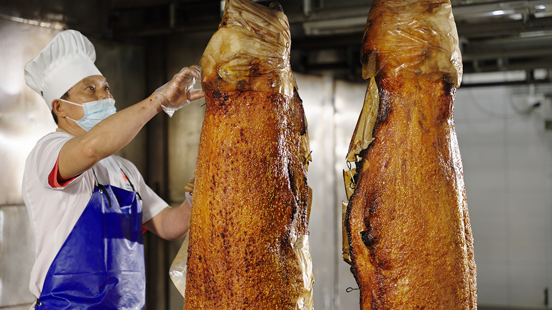 据介绍,制作黄阁烧肉需要“三进三出”,经过焙皮、打皮、起皮等步骤,最终将猪肉体内的水分彻底烤干,才能获得“爆皮”。其中最难把控的,便是烧荔枝柴的火候,火太大容易烧焦,火太小又不能实现“爆皮”,十分考验师傅的技艺。