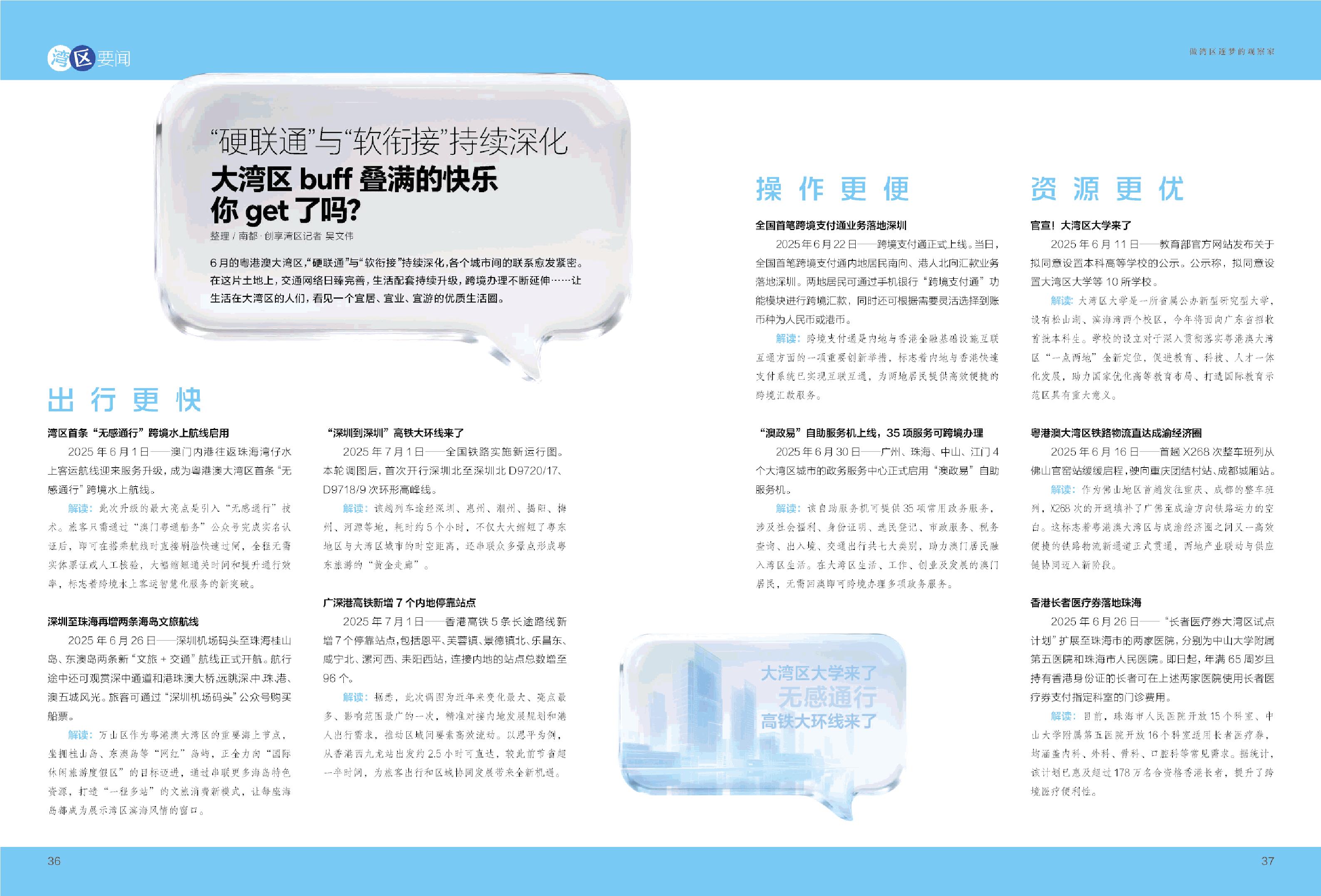整理 / 南都·创享湾区记者 吴文伟 6月的粤港澳大湾区,“硬联通”与“软衔接”持续深化,各个城市间的联系愈发紧密。在这片土地上,交通网络日臻完善,生活配套持续升级,跨境办理不断延伸……让生