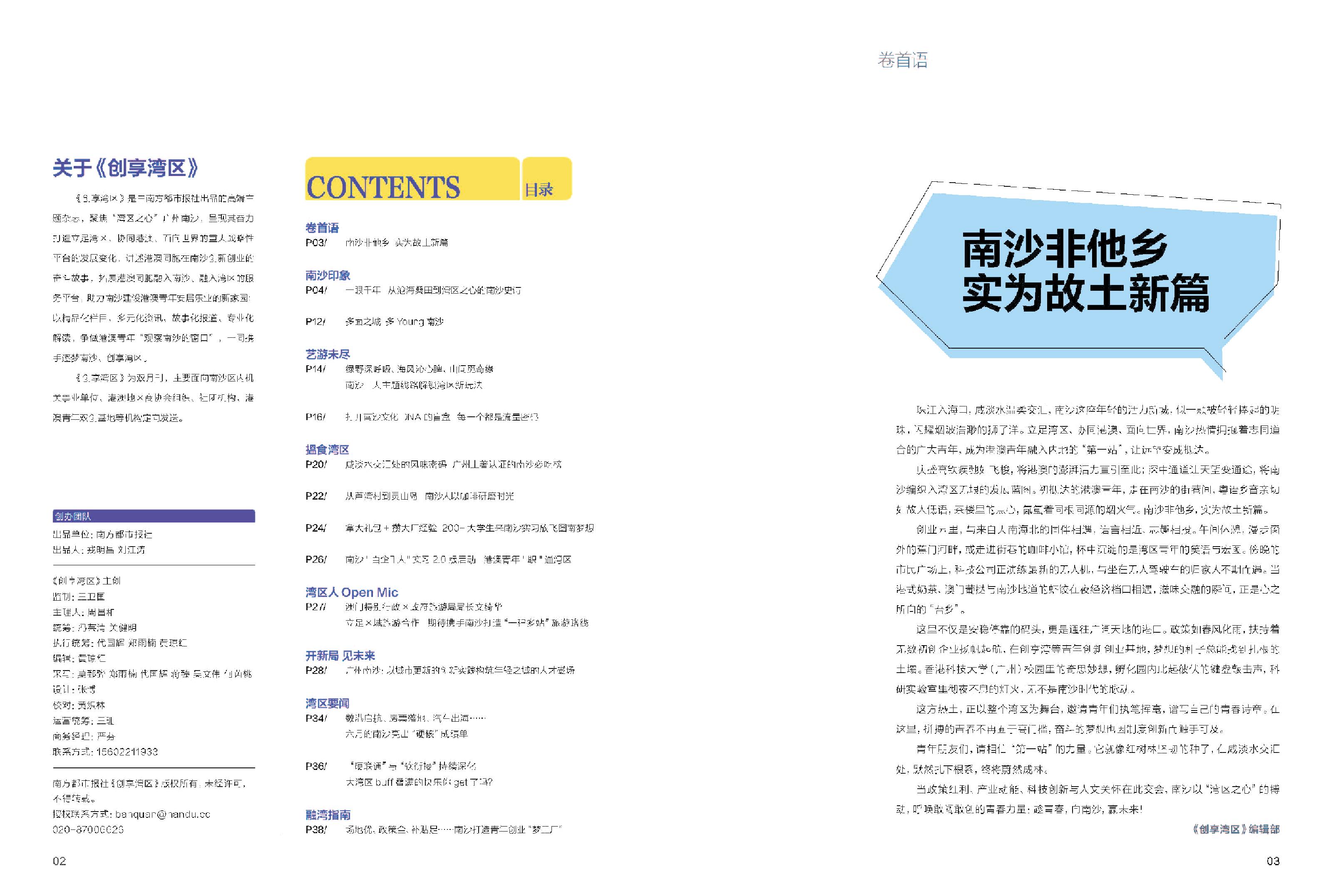 《创享湾区》是由南方都市报社出品的高端主题杂志,聚焦“湾区之心”广州南沙,呈现其奋力打造立足湾区、协同港澳、面向世界的重大战略性平台的发展变化,讲述港澳同胞在南沙创新创业的奋斗故事,拓展港澳同胞融
