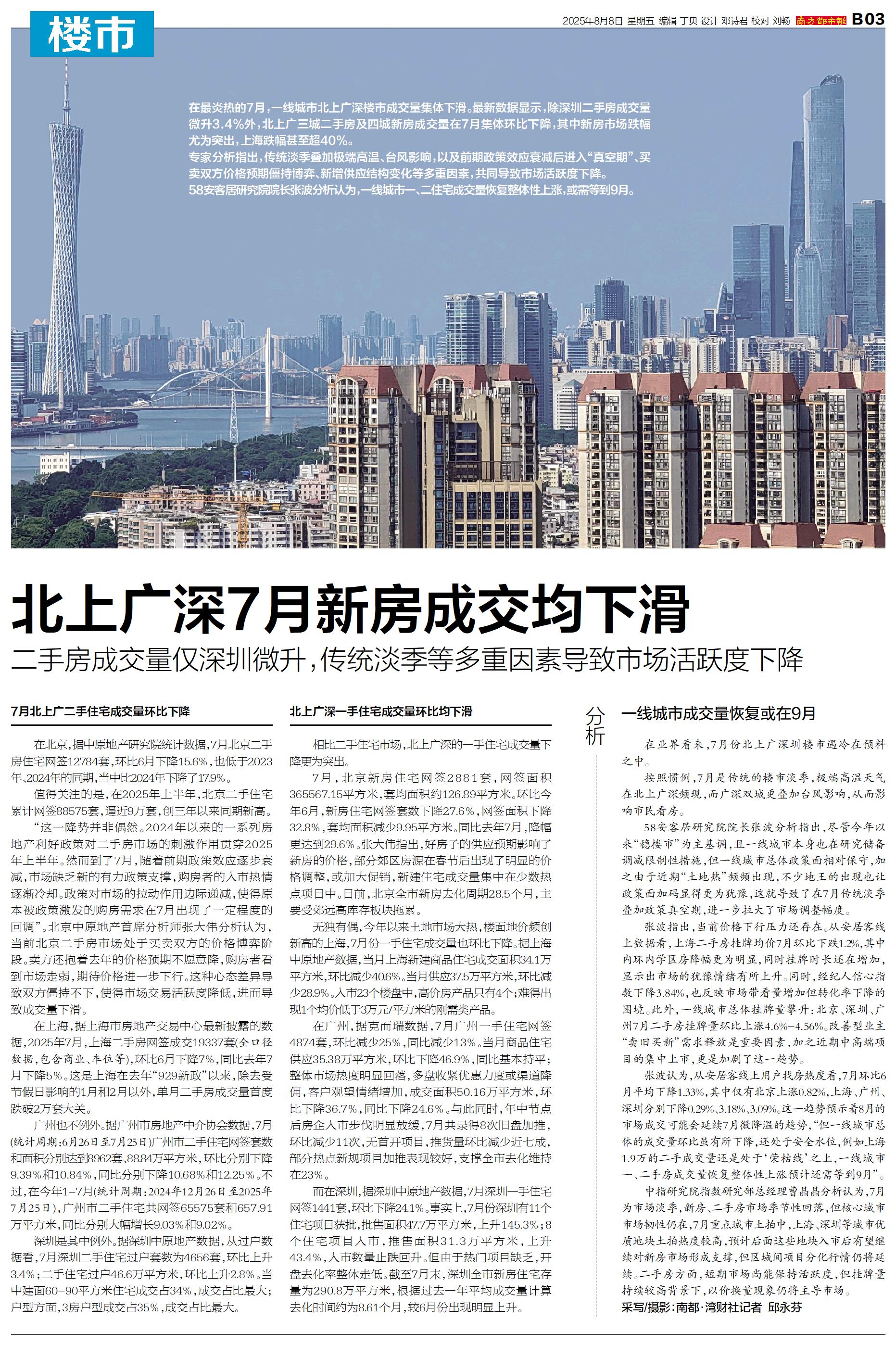 北上广深7月新房成交均下滑