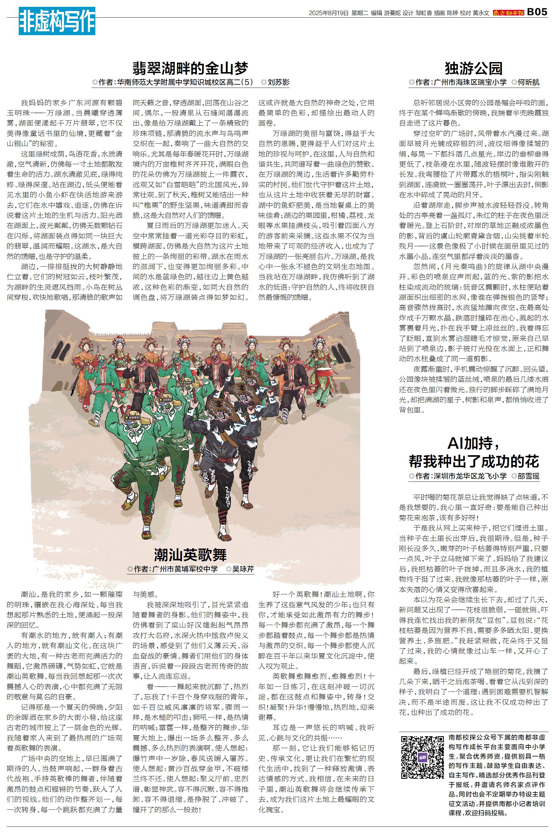 ◎作者:广州市海珠区瑞宝小学 ◎何昕航 总听邻居说小区旁的公园是幅会呼吸的画,终于在某个蝉鸣渐歇的傍晚,我揣着半兜晚霞独自走进了这片暮色。 穿过空旷的广场时,风带着水汽漫过来。湖面早被月光