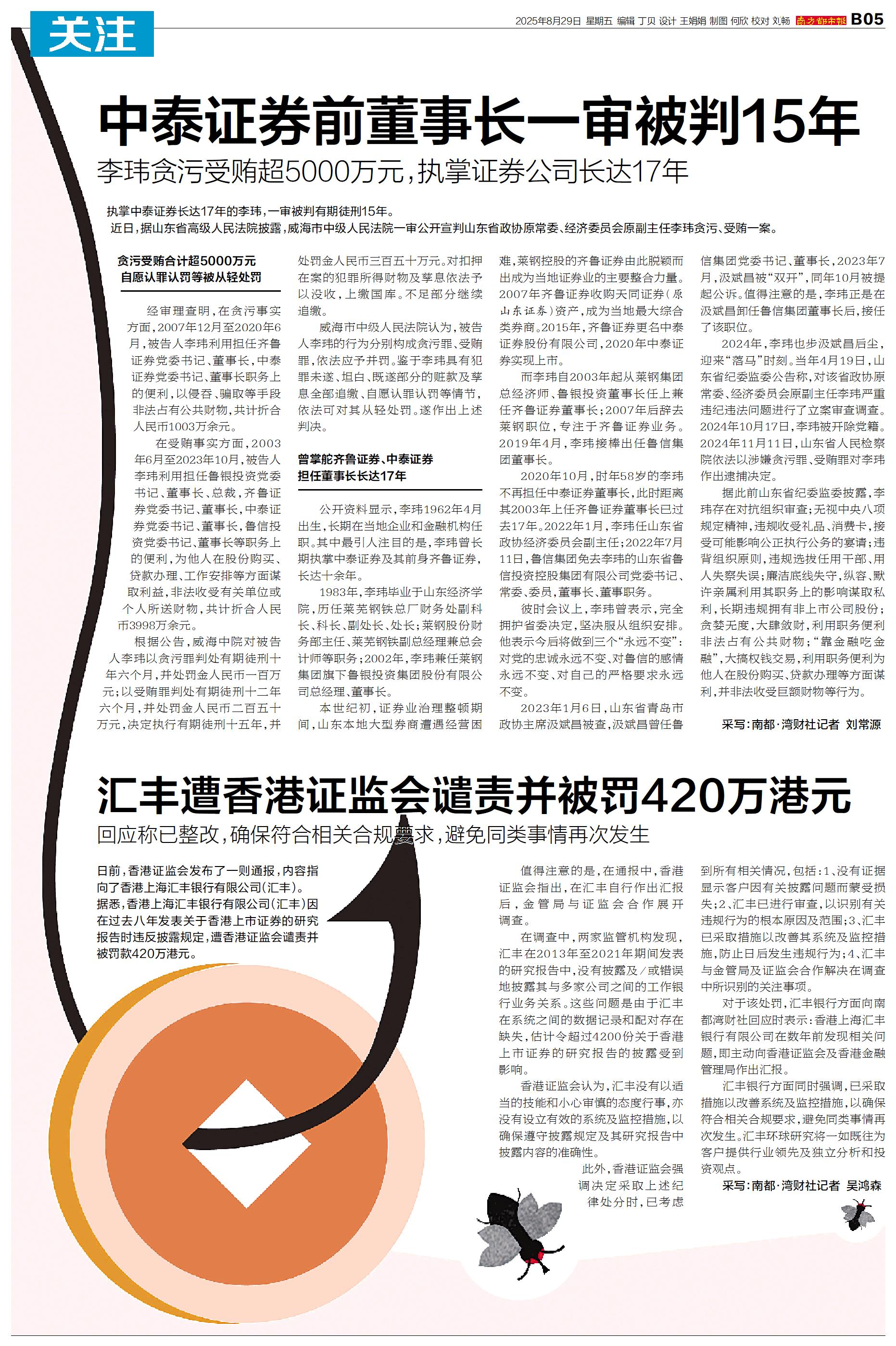 执掌中泰证券长达17年的李玮,一审被判有期徒刑15年。 近日,据山东省高级人民法院披露,威海市中级人民法院一审公开宣判山东省政协原常委、经济委员会原副主任李玮贪污、受贿一案。 贪污受贿合计超5