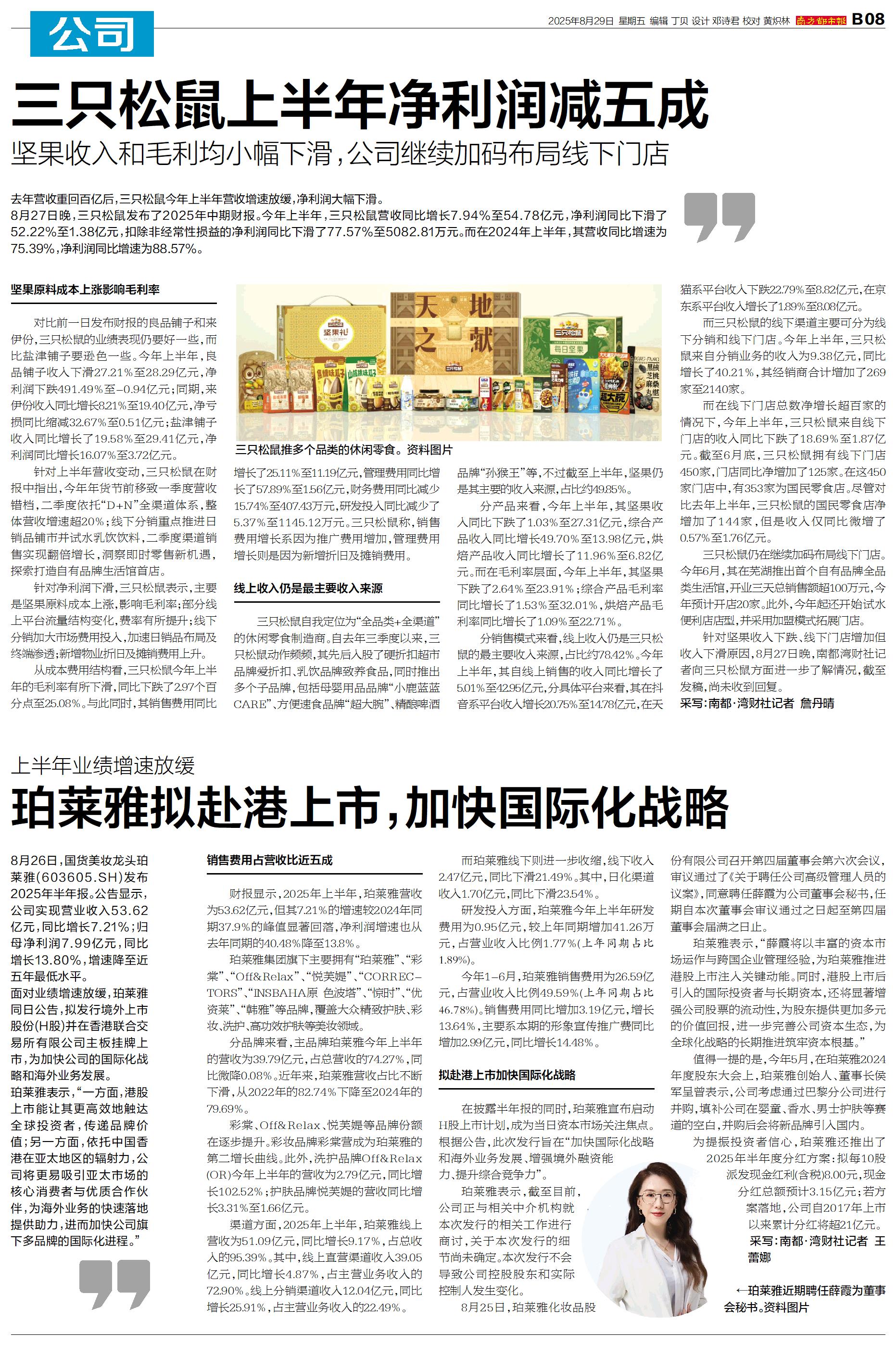 去年营收重回百亿后,三只松鼠今年上半年营收增速放缓,净利润大幅下滑。 8月27日晚,三只松鼠发布了2025年中期财报。今年上半年,三只松鼠营收同比增长7.94%至54.78亿元,净利润同比下滑了