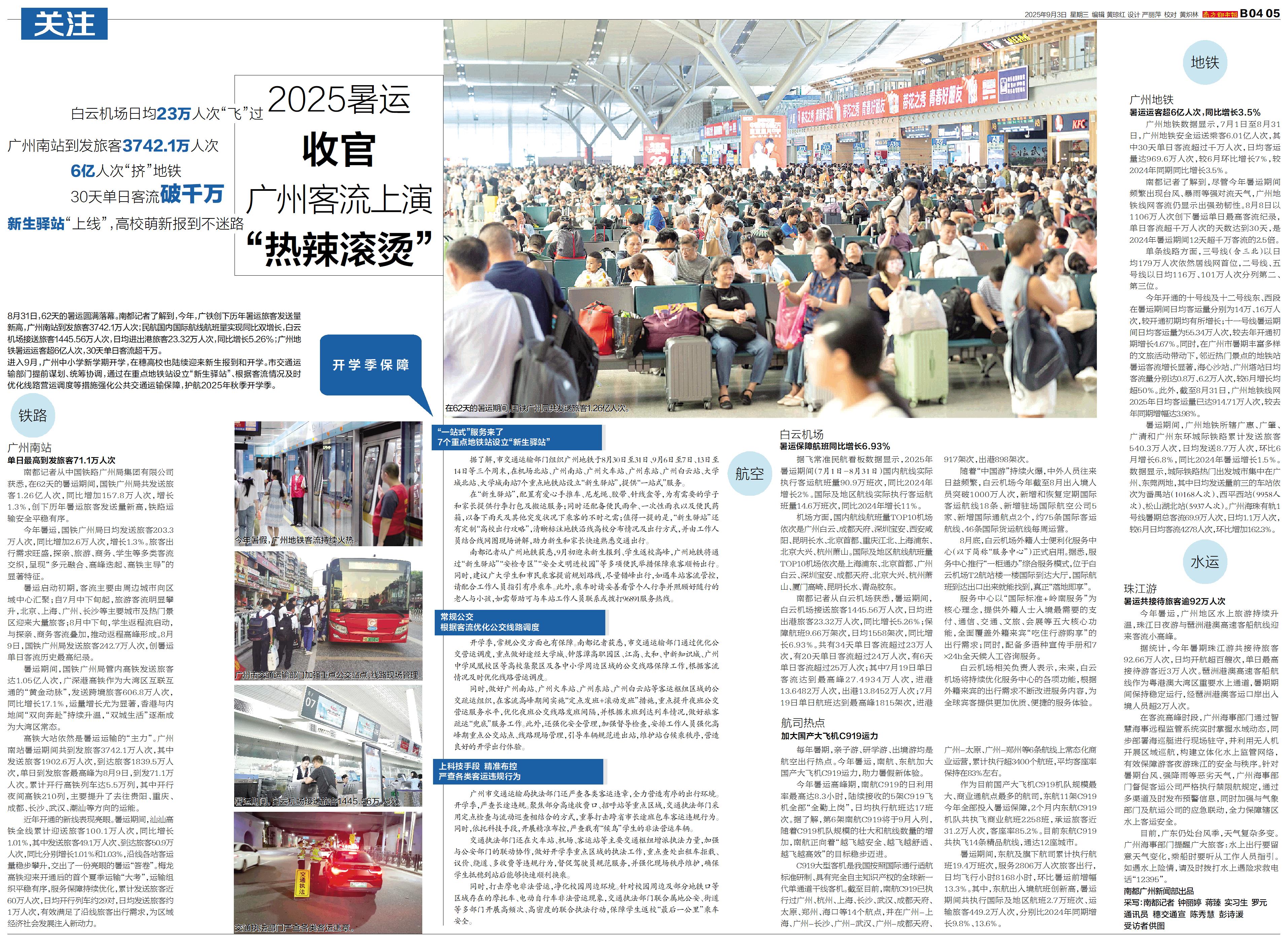 白云机场日均23万人次“飞”过 广州南站到发旅客3742.1万人次 6亿人次“挤”地铁 30天单日客流破千万 新生驿站“上线”,高校萌新报到不迷路 8月31日,62天的暑运圆满落幕。南都