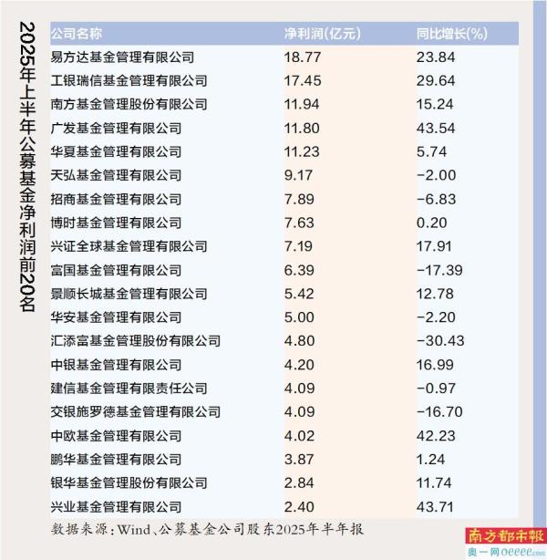 2025年上半年,已披露数据的公募基金公司中,净利润超10亿元的基金公司增至5家,行业利润向头部集中的趋势加剧,前十名合计贡献行业超60%的净利润。
