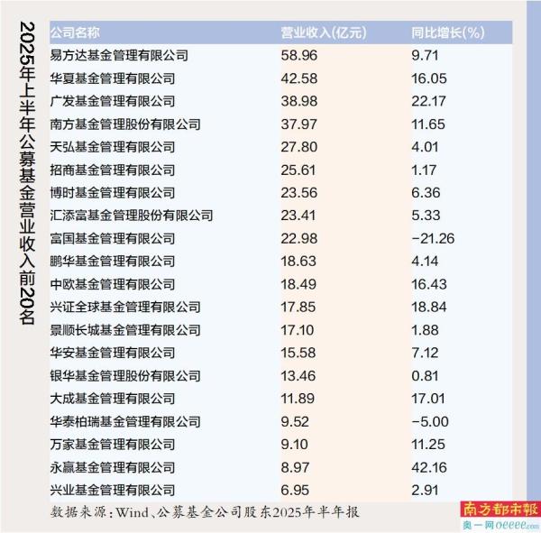 营业收入TOP20:易方达、华夏、广发居前三 永赢基金42.16%增速亮眼