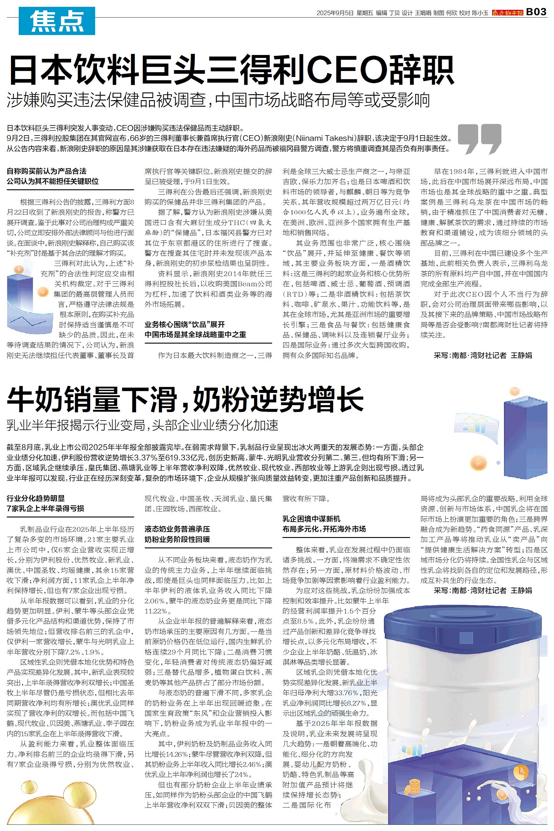 日本饮料巨头三得利突发人事变动,CEO因涉嫌购买违法保健品而主动辞职。 9月2日,三得利控股集团在其官网宣布,66岁的三得利董事长兼首席执行官(CEO)新浪刚史(Niinami Takeshi)