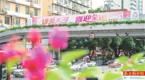 天河区的人行天桥上“绿美天河 喜迎全运”的标语让过往车辆内的市民游客清晰可见。